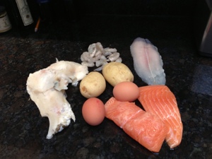 So what did the big people eat? Well, as I decided to have a freezer clear out, the answer was fish pie. It is very easy and you can be very creative making fish pie. I use either what I have in the freezer or what ever takes my fancy – it is usually the former. Quantities are rather elusive I am afraid!