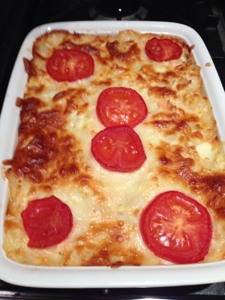 Mix together the butter, the cornflour and the milk, put in the microwave on high for one minute, stir well and repeat the process until the sauce is thick and creamy. Add the cheese and repeat again for the cheese to melt. Season to taste. If by any chance you are distracted and do not stir sufficiently and the sauce goes lumpy, do not despair, a quick whizz with a whisk or hand held blender will quickly put it to rights. Put all the mixture into a gratin dish sprinkle cheese over the top, decorate with some tomatoes and bake on a medium heat (175C) for about 20 minutes or until golden brown. It freezes well so if there is any left overs, save it for another night.