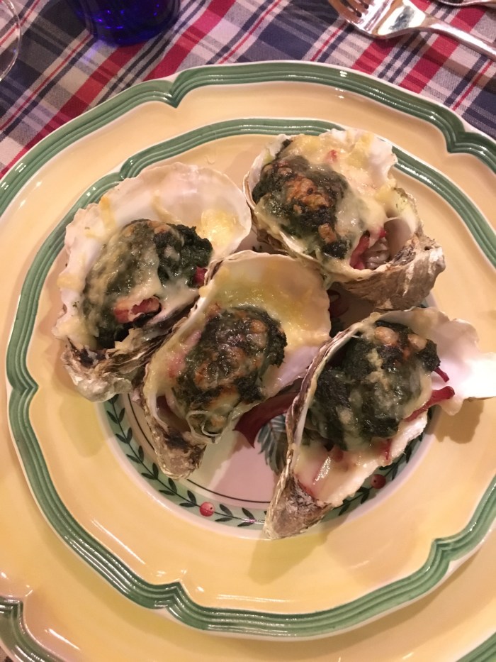 Researching all things Oysters, I came up with as many variations of Oysters Rockefeller as there are cookery books on Oysters. For Starters, it is claimed that the original was created by a chef working in Antoines restaurant in New Orleans, Louisiana, in the late 1900’s.Someone,dining there declared that they were as rich as Rockefeller! Not surprising really as a) New Orleans is on the Gulf coast of the USA, where Oysters, Shrimp ( read very large ones) , Crawfish and Soft shell crabs abound, and b) the home of good food in the USA, or should I say rich food, not necessarily all good, lots of fried food, but having said that, Oyster Po-Boys are one of my favourites.