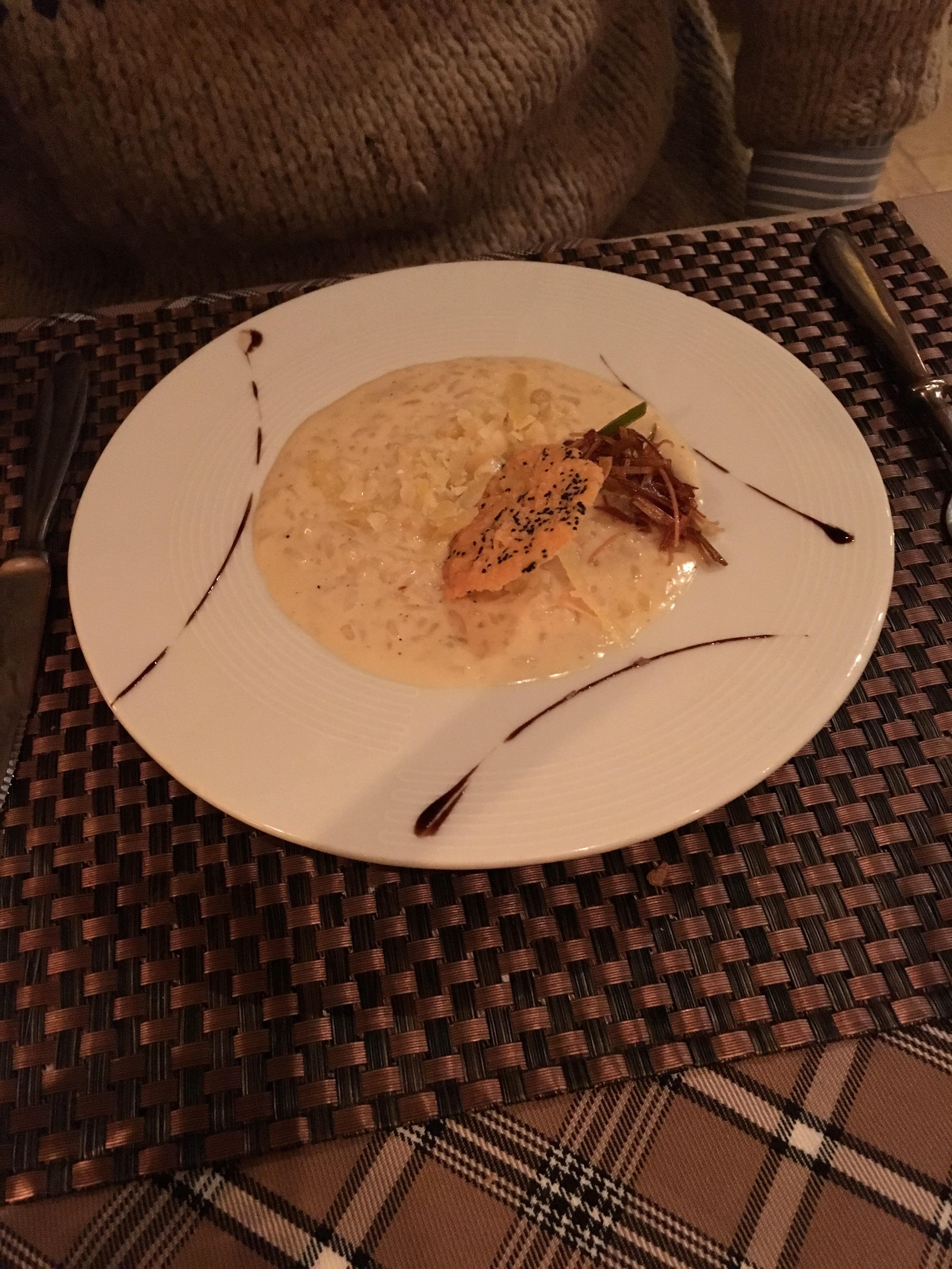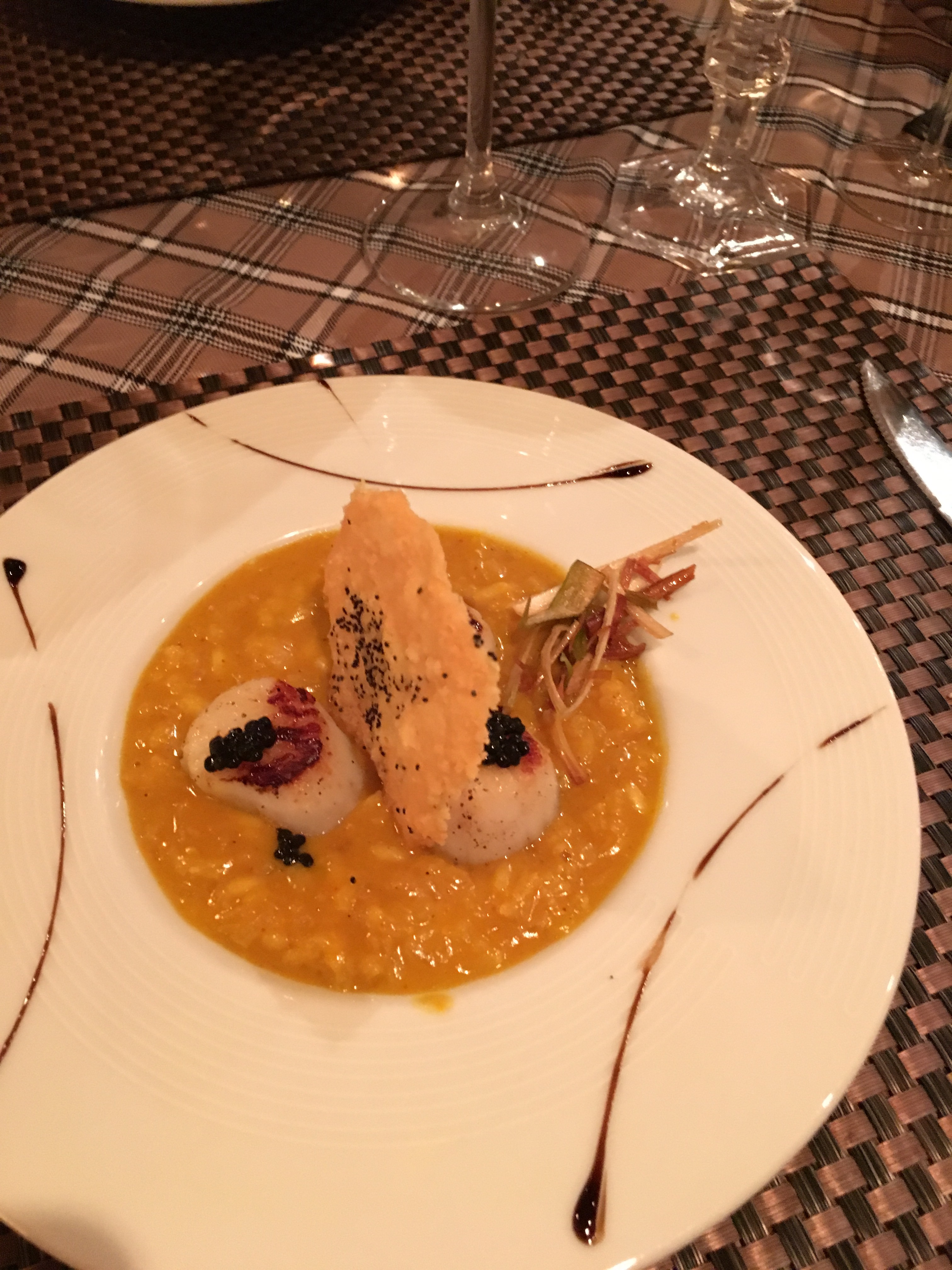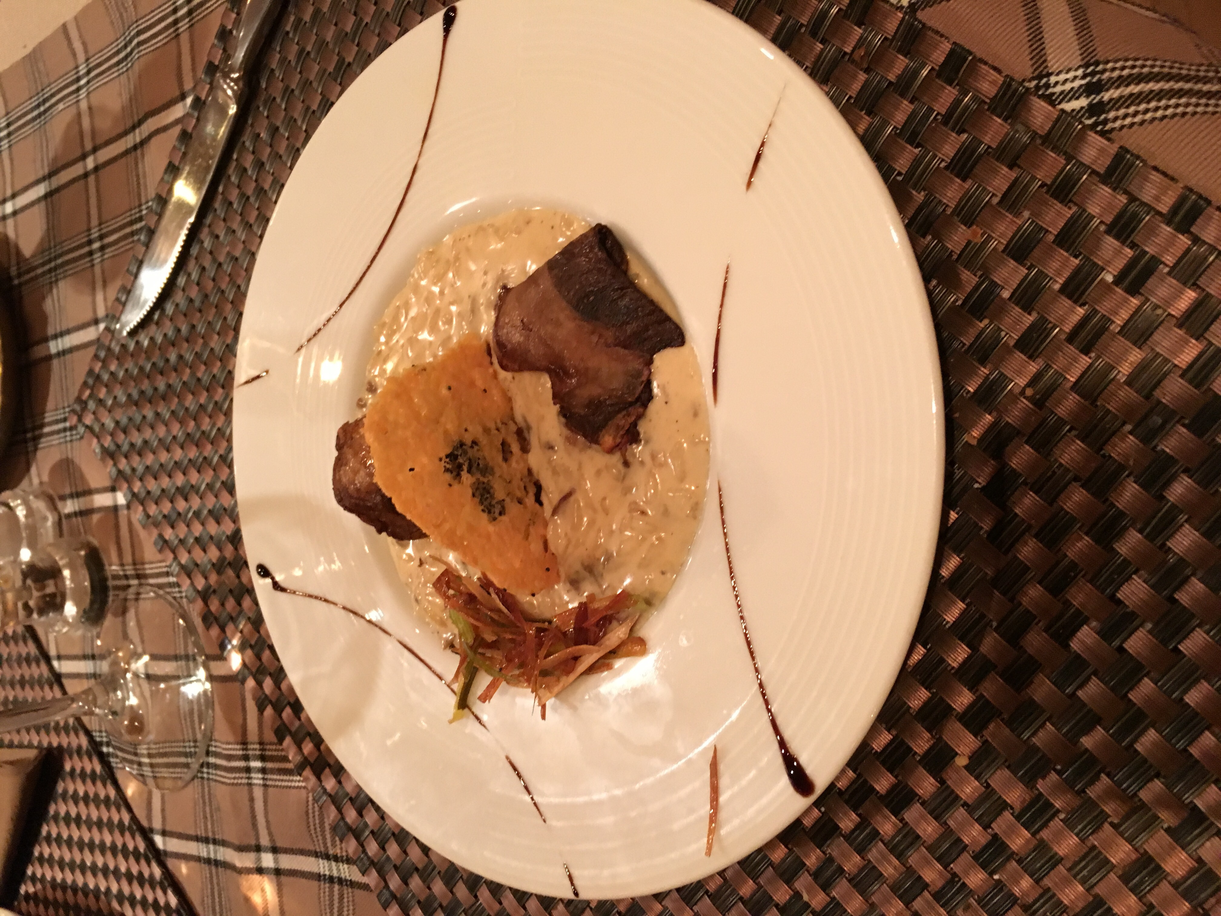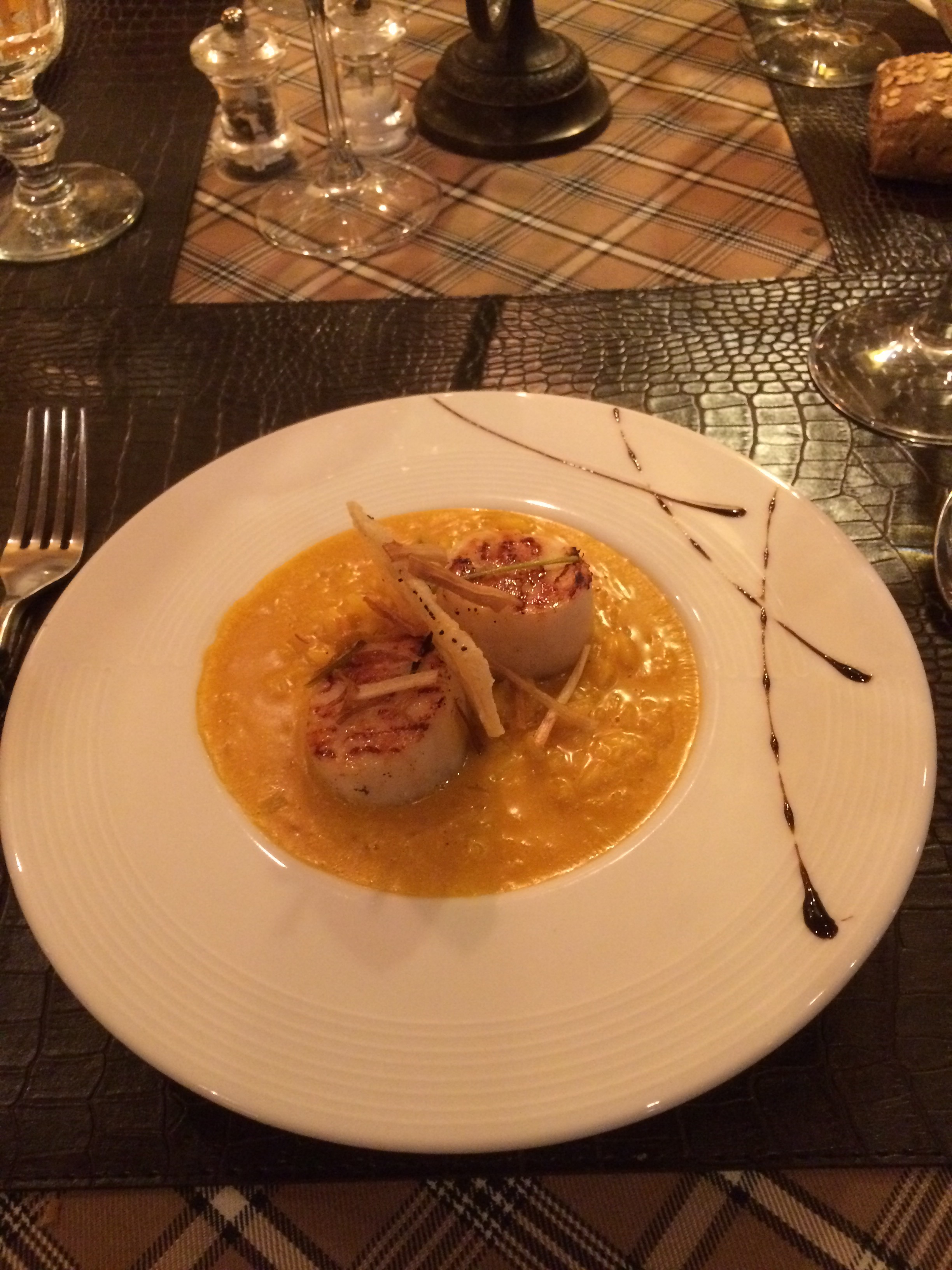 So once again, we had an amuse Bouche of the cream vegetable soup, again very acceptable . For our starters, the three of us chose a risotto , albeit three different ones. A risotto au fromage, a risotto with scallops and a risotto aux cepes. All arrived at the same time, all were perfect and all were al dente. And as they were three very different risottos, they had been cooked seperately.