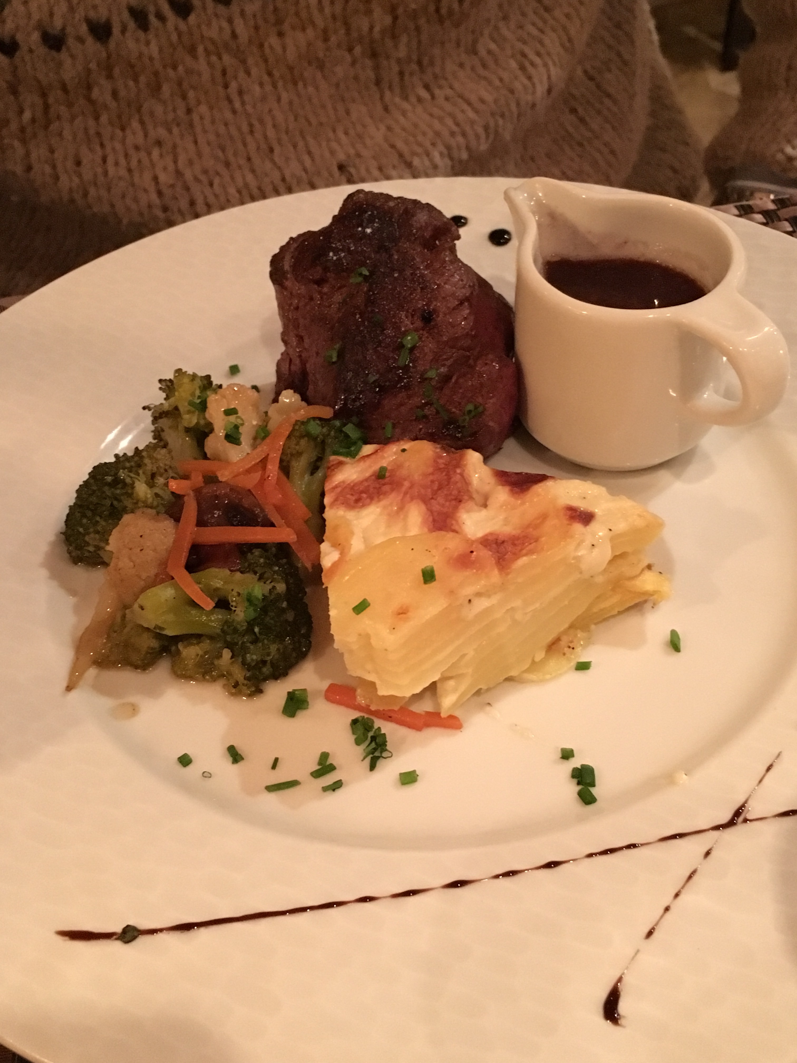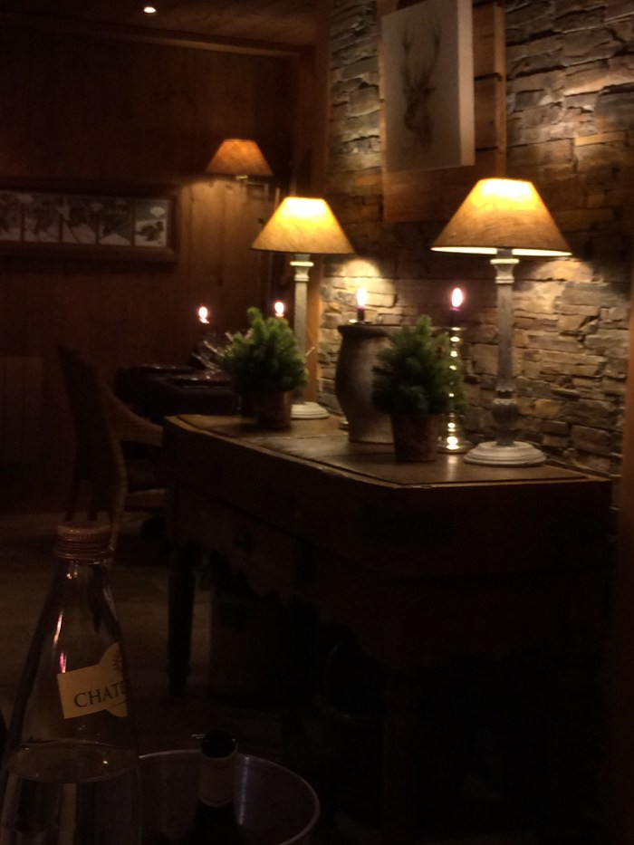 So, there is one restaurant that fits the bill, as being not the usual run of the mill and it is L’Outa, in Les Gets. When we first saw the restaurant, we thought it to be a very smart antique shop, refined old pine fittings and soft lighting. But we were wrong, it is a lovely smallish restaurant, with about 30 covers. It also has a wine bar, ( yet to be tried) and a salon de thé ( also yet to be tried) . It is owned and run by Jaqueline and Phillipe François ( I think he could be the chef), she is the front of house and head waiter, and slightly dotty. One time when we called, to ask if they were open, Madame responded, oh I don’t know, call again in the morning ( I have to admit it was out of season). So we have been there now, several times, both winter and summer and out of season . In the summer we eat outside in the garden and in the winter of course inside where it is warm and cosy , we have never been disappointed.