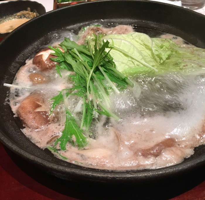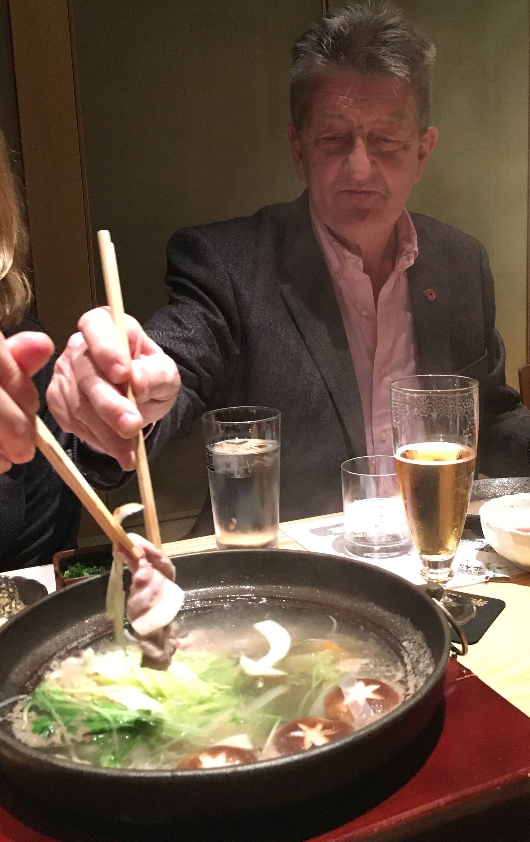 This trip sees us in Japan, at the moment in Tokyo. Last night at the request of himself ( he who had fond memories of his various visits here) saw us eating in a traditional restaurant ( named Karen) eating Shabu-Shabu. Roughly translated it means Swish-Swish! Which is the sound the beef makes as you swish it, just one time back and forth around in the hot pot.