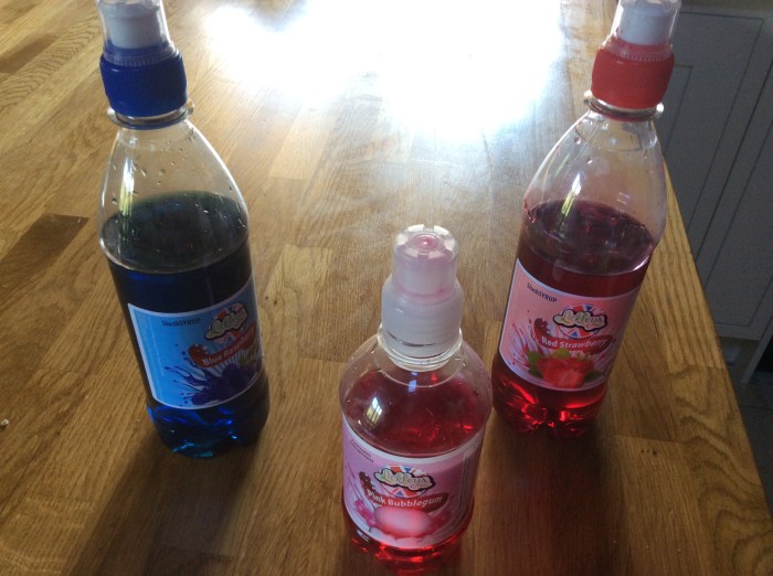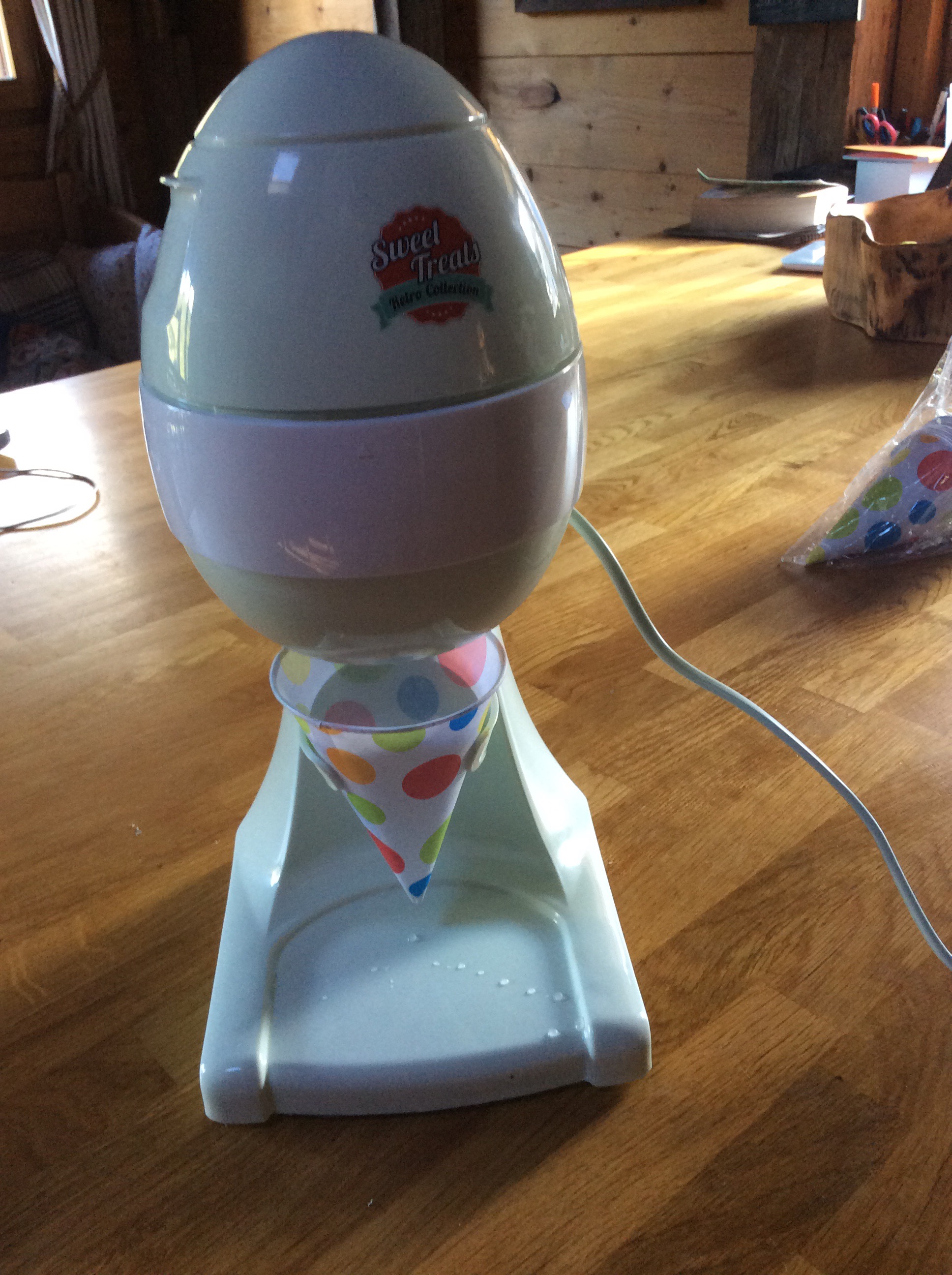 The next adventure was making Slush Puppies, or Snow cones. A very American thing but oh so much fun and just think of those E numbers!! I bought a slush puppy machine, basically and electrified ice shaver, a bunch of paper cones and special flat ended straws ( easier to slurp up the ice) and three different syrups to flavour, Pink Bubblegum, ( sounds disgusting) , Red Strawberry and Blue Raspberry. Slush puppies made and Slurped to everyone’s enjoyment!