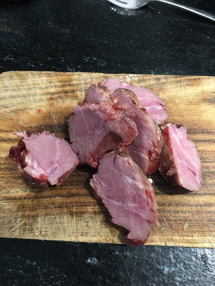 On ‘Googling ‘veal cheeks sous vide I discouvered that they need Dunking for a mere 48 hours. I trimmed the cheeks, vacuum packed them set the pan of water to a temperature of 140 F and when it reached this I put them in the pot, making sure that they were well submerged, covered the pot with cling film to help reduce the evaporation and left them for 48 hours! Himself was given a dire warning “Do Not Touch !”