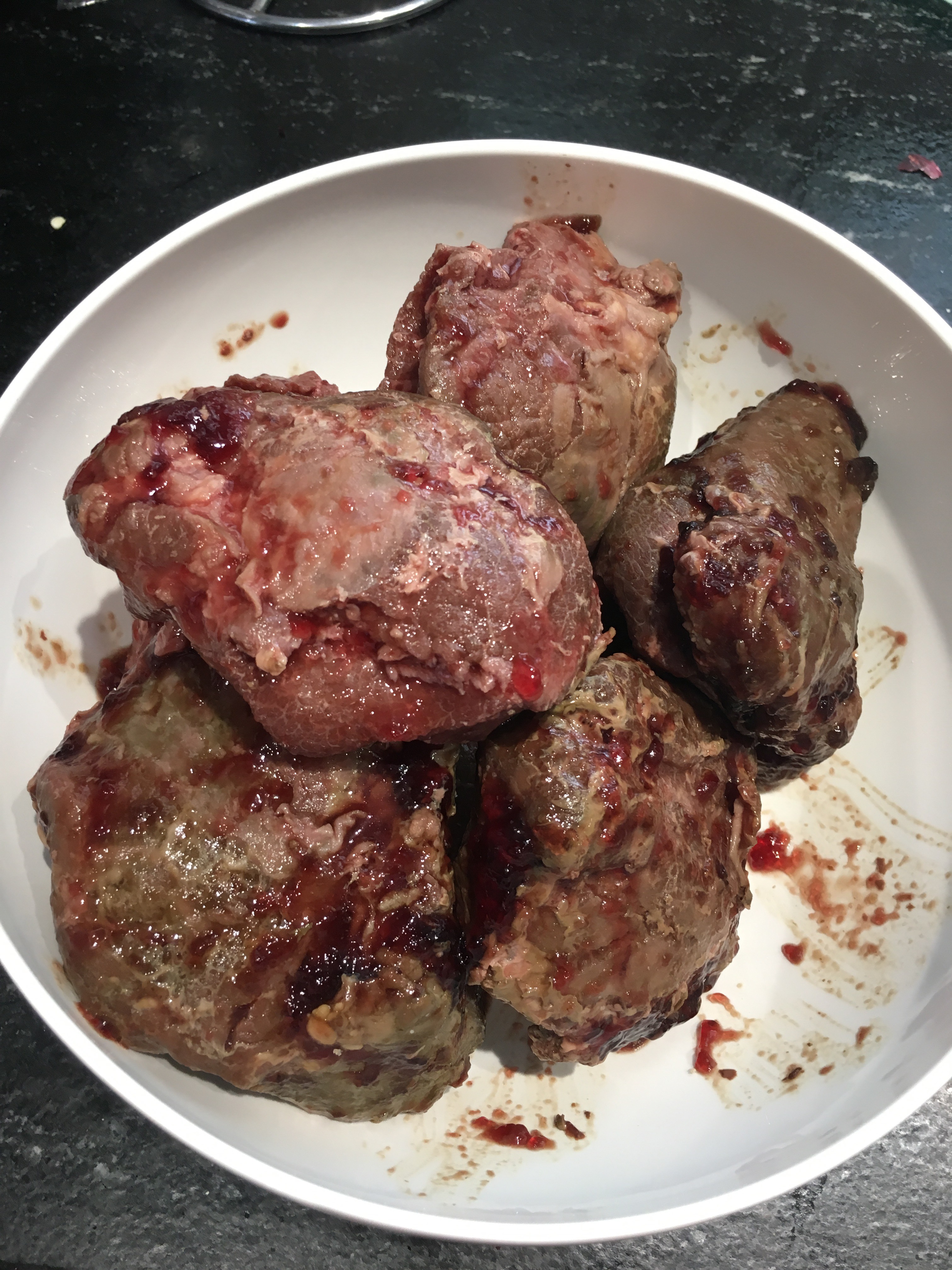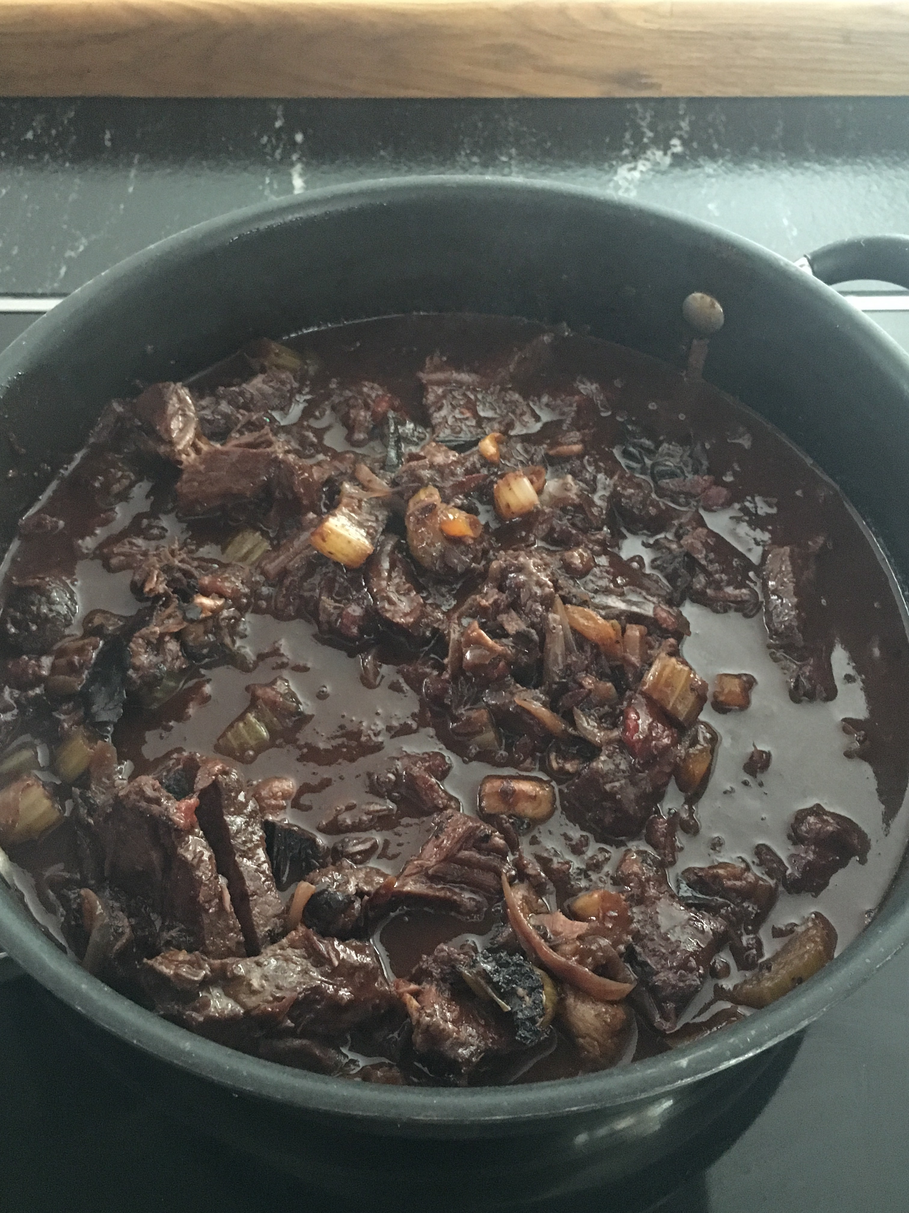 So after a couple of days, the machine beeped at me so I removed the cheeks and left them to cool, cool enough to handle. They were then trimmed and sliced, onions were also sliced and sautéed, along with some celery, garlic and mushrooms. This recipe, actually a non recipe, was created on the hoof. I added about a bottle of Malbec red wine, about 4 oz butter, some black currant jelly, salt and pepper.