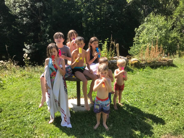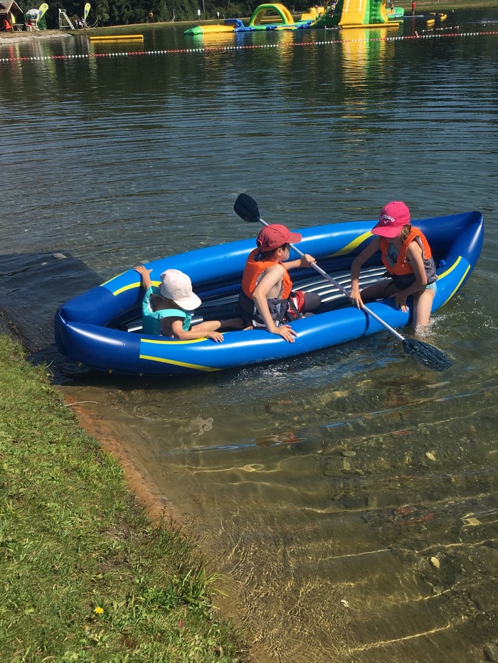 It is summer time which means we are in the French Alps along with some little ones, ( getting bigger each time they come ) ! Have only been here a couple of days, but so far have been to the local Lake, where they tried out the new Blow Up Kayak, a big success but would help if Himself read the instructions first! Where was the seat? And the rope to pull it! But never mind, he didn’t tip them out ( they had been forewarned). Life jackets on, they were safe! Rubber rings, buckets and spades, hats and sun cream to the fore! And the waterfall waterslide is always good fun, even though the smallest is way too small, he was happy looking for tadpoles and pottering in the ice cold Mountain water.