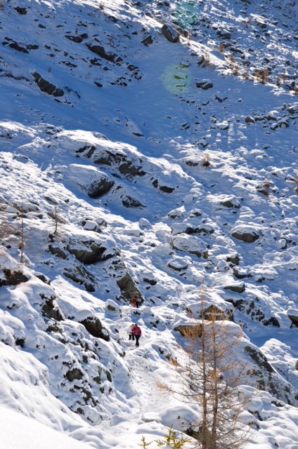 A drive to the top of the mountain, donned snow shoes and set off! The sun was shining, the ski tourers were coming down from the top of another mountain, children were sledging and Mont Blanc glistened in the distance.