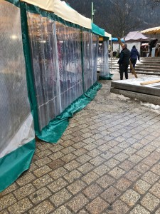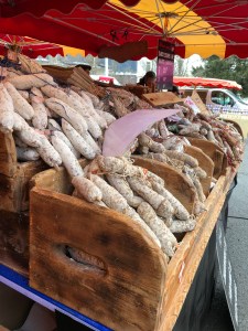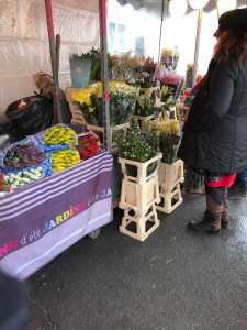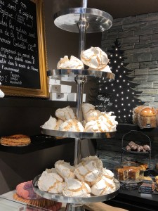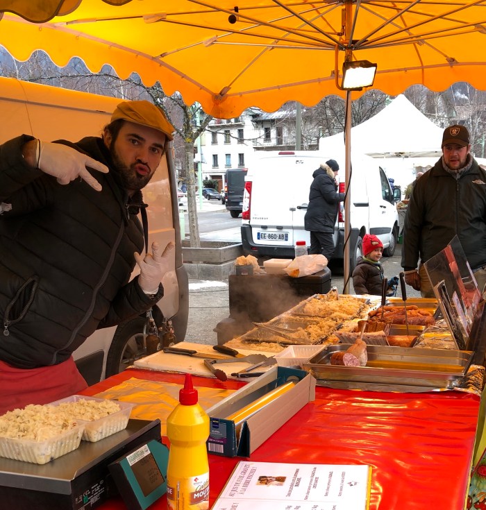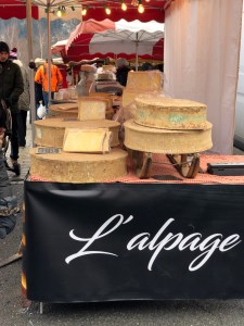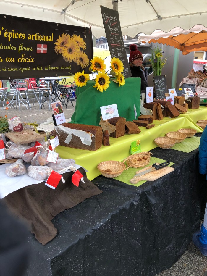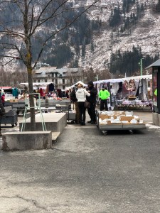 But I digress, we went to Chamonix to go to the market, yes, Saturday is market day. We have never been to this market in winter before and so it was interesting to see how innovative the traders were in an effort to keep warm. The fruit and vegetable sellers had plastic tents surrounding them, along with heaters inside, as did the flower seller. Others worked outside with portable heaters or just thermal clothes, boots and gloves.Always at these markets are the fruit and veg sellers, the cheese people, the sausage and cold meat sellers, the fish man and two sellers that I can not get my head around. The Pain d’Epices, which is basically gingerbread but drier and the Nougat seller! I did ask the Monsieur “The what and the why? The answer, quiet simply , ” They have a sweet tooth and eat it like chocolate !The other almost permanent residents of the markets, are the cooked chicken seller and the Choucroute seller, the chicken people always have a large queue for their chickens and not such a big queue for the Choucroute, but nonetheless a queue.