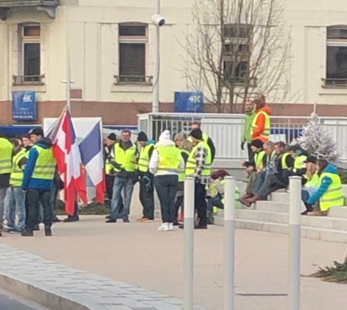 Also whilst in Chamonix we visited a museum, which gave a potted history of the town and a tearoom, which was awash with Macaroons! I must remember to bring #1 grandson here in the summer as not only did they have Macaroons but Meringues as well, both of which he loves ( as do the others).On our return journey, down the mountain road which I really dislike , we came across in Cluses, a dreary town halfway between Chamonix and ourselves, the only protestors of Les Gilets Jaunes, I have to say they were not very impressive!