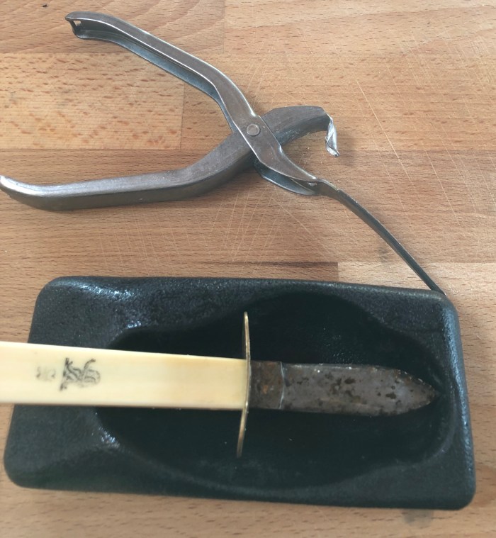 Back, at Chez Nous, Himself set to with the oysters. If you like oysters but find the idea of shucking them too daunting, then explore a fish shop and you might find a device which’ makes shucking a ‘Piece of Cake”!