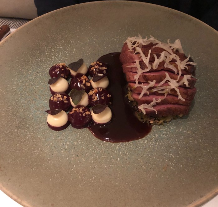 Having perused the Menu, Friend, asked me ” what is Soulard Duck”? Not a clue was my reply, a quick Google found it to be a tho of duck from the Vendée in France, either fatty or not fatty, I assume a bit like Gressingham Duck Of UK origins. The menu stated only Soulard Duck, no mention if it was breast or leg or confit ( it turned out to be breast). However, when the Maitre D was asked about Soulard Duck , he looked down from great height ( he was even taller than himself) rather snootily and told us. So we ordered , me the green asparagus, Himself the caramelised onion tart and Friend carpaccio of fish, followed by the Duck, Himself, Lamb Wellington and myself the Cod, ( with more asparagus but this time white.
