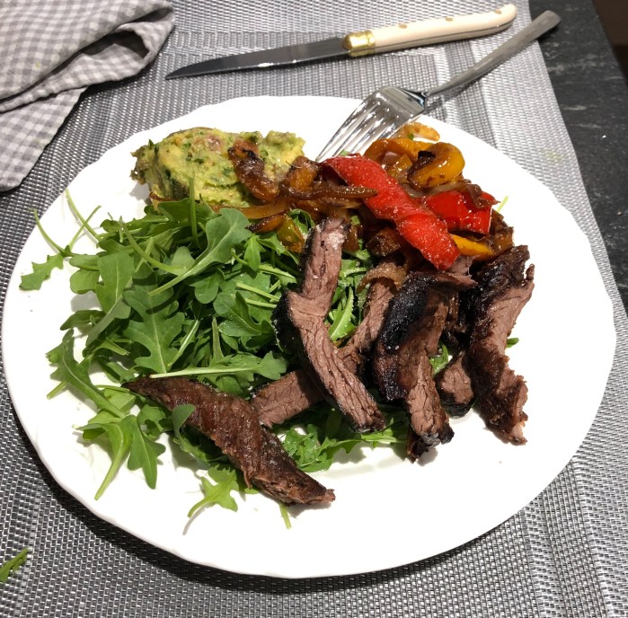 Fajitas for dinner! Onglet is in the sous-vide, Guacamole made, ready to go, onions and peppers sautéed and dessert made. How organised is he, even the washing up is done and dusted.