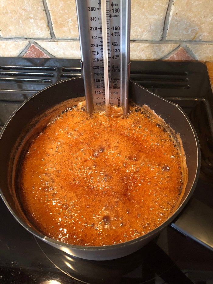 Don’t think that you can turn the heat up high and in no time at all it will be at the right temperature, because it won’t and in the meantime you will have a burnt on mess in the bottom of your pan. A cooking thermometer is a good investment.