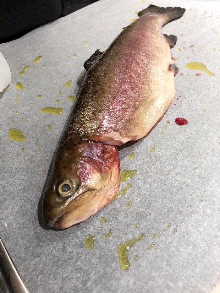 Very simply take a sheet of greaseproof paper, grease it with some olive oil, place the fish on it and make it like an envelope. Seal ( I stapled them shut). You could put some lemon or onion slices along with some dill in along with the trout. Place on a hot BQ grill and cook for about 10-15 mins. Do no turn over, all the juices will run out, but after 10 mins open the envelope a little and insert a fork or knife. If it slides in easily, then the fish is done.