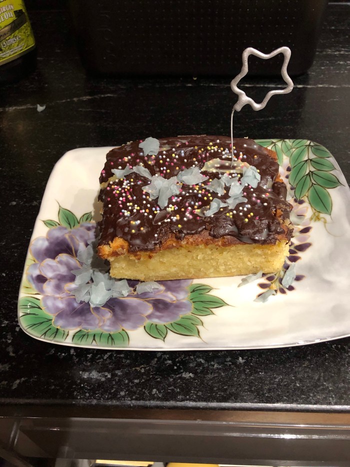 As it was his birthday, Willowy Brunette had baked him a cake. A very moist Coconut cake with chocolate ganache icing.