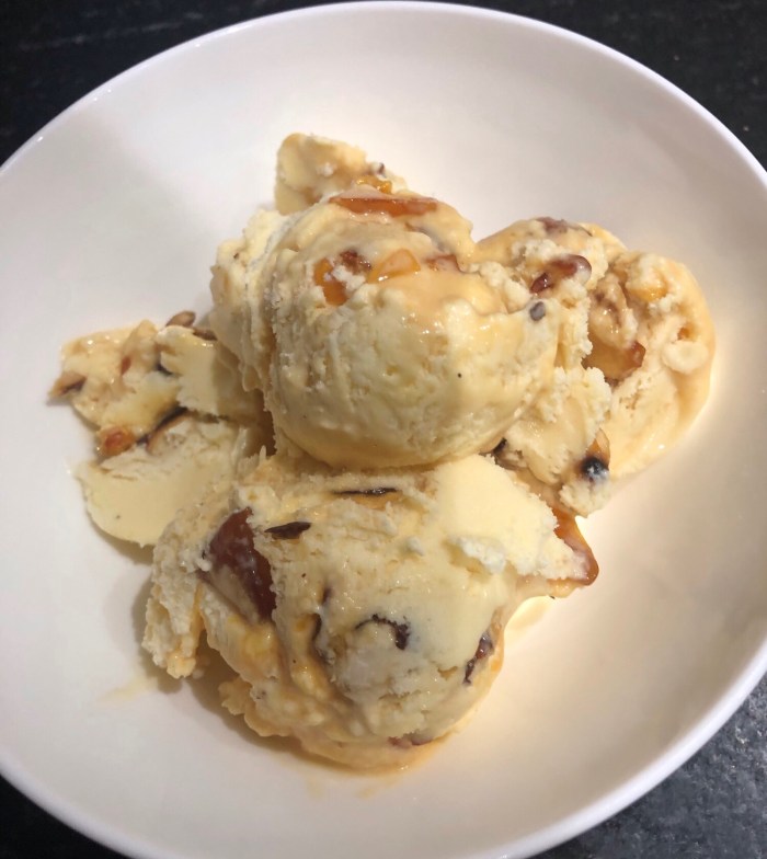 When the ice cream is almost frozen, stir in the nuts and the caramel bits, mix well and return to the freezer.