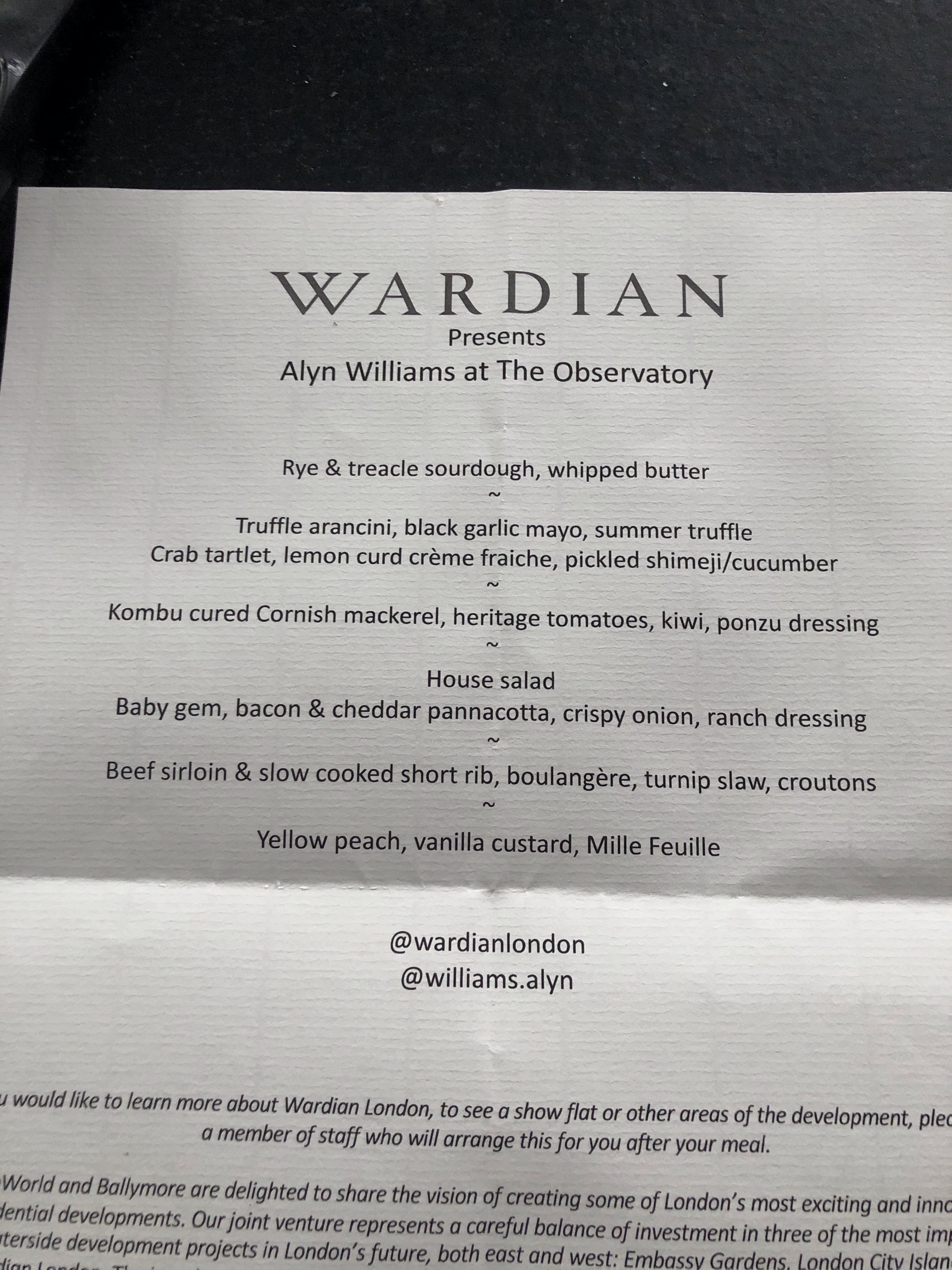 The chef who was apparently hired to entice us to eat and to buy a flat ! But no one even showed us a brochure. Disappointed? No not really. Alyn Williams was the chef, formerly of the Westbury where he held a Michelin Star for 8 years.
