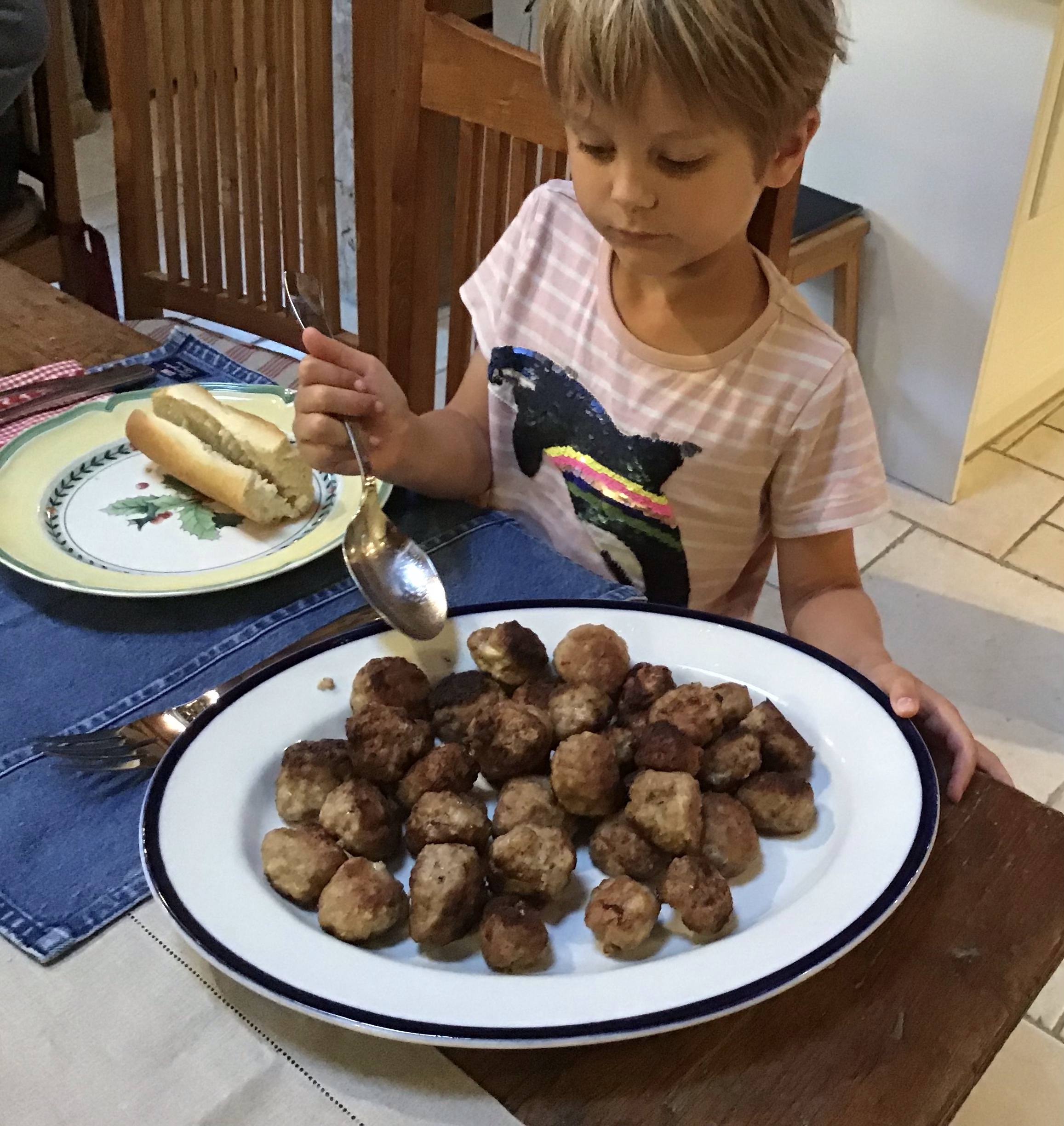 I rummaged in my freezer and came up with minced beef and Turkey breast. The IKEA meat version called for a combination of pork and beef but Turkey and Beef would have to suffice, after all it was Sunday afternoon and no grocery stores were open. This quantity makes between 35 and 40 meatballs. We actually made 38, which meant Sam having to use his 7 x table to work out how many we each could have! (5 each and three remaining ).