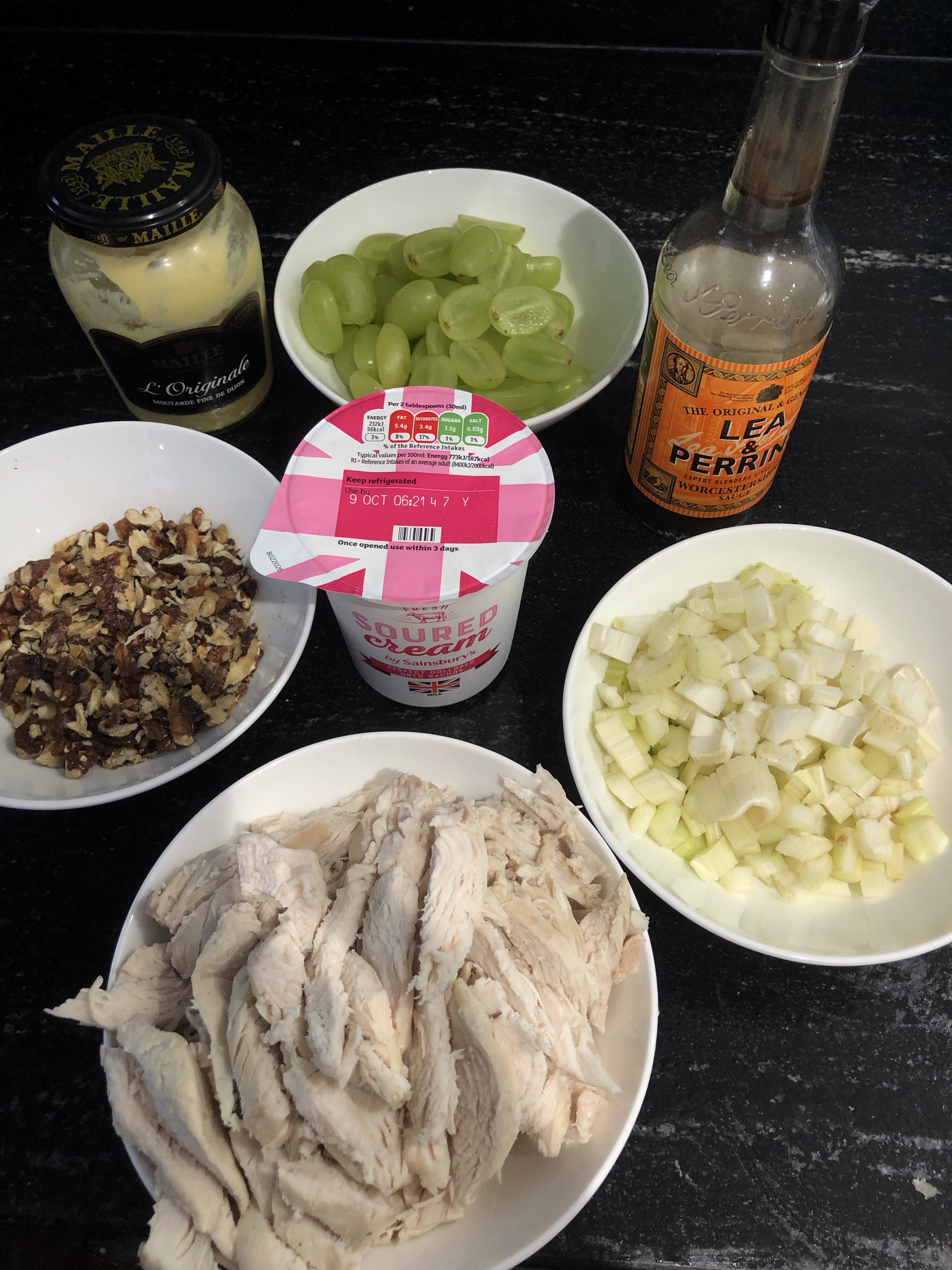 Sometimes the old ones are the good ones. I have recently Culled some of my cook books. I may live to regret it, but went on the principle of, “ if I haven’t ever used that book, or it’s been a very long time since I used that book, or simply it has really gone out of style” then it was time for them to go! Especially as I had several new ones ready to take their place. But as I have said before, I also have a filing system on a totally separate iPad just for recipes, ideas and information. Today, I needed to have dinner/ supper ready before we went out. And so it was on one of my very rare trips to a very small supermarket that I spied green grapes! Bingo! Chicken salad with grapes.