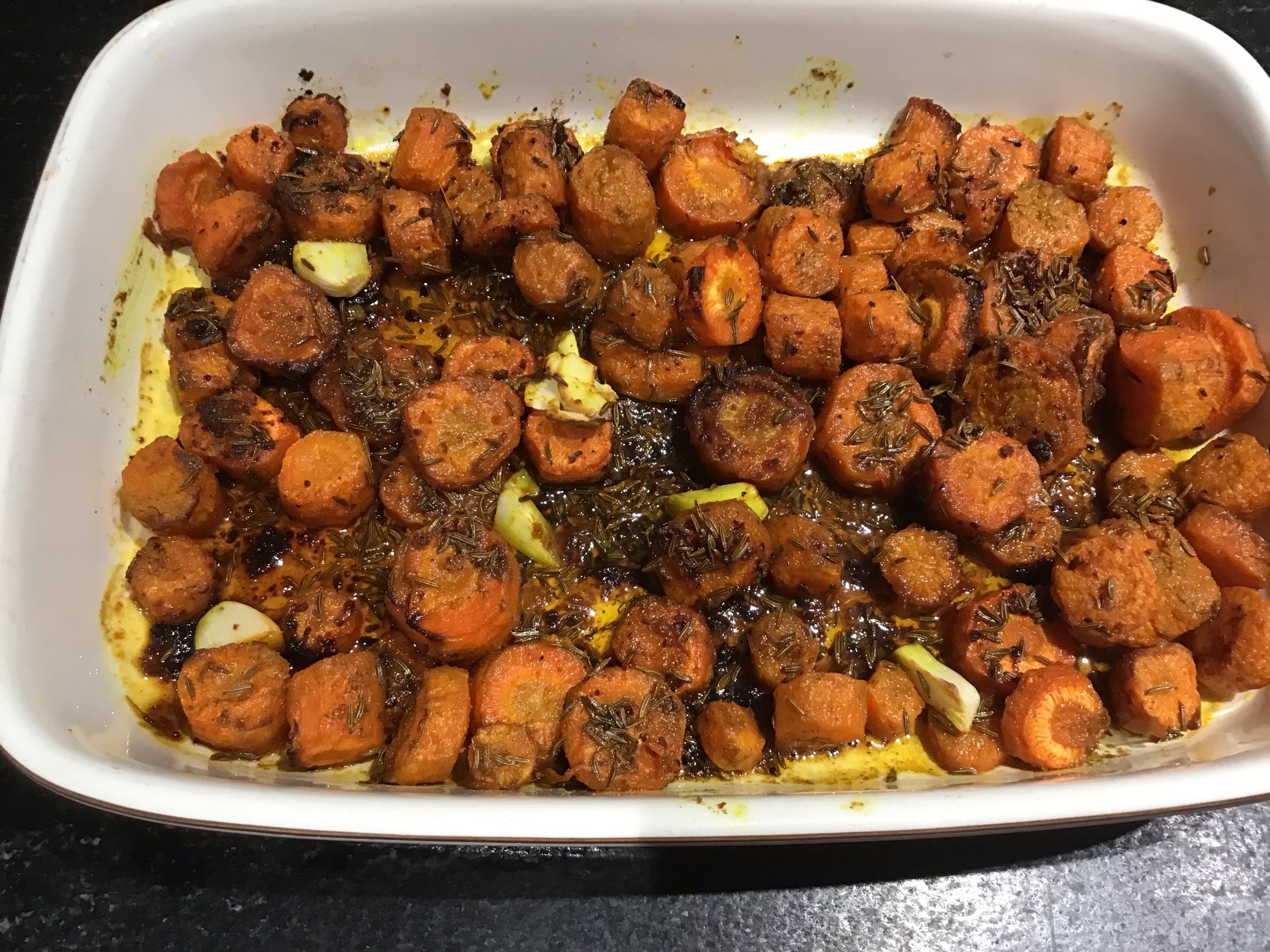 Heat the oven to about 160 C, put half of the oil and spices into a roasting dish, add the carrots and garlic, and roast for about 30 minutes until the carrots are almost soft. pour over the maple syrup and roast for about 10 minutes or so, the carrots will become slightly golden.