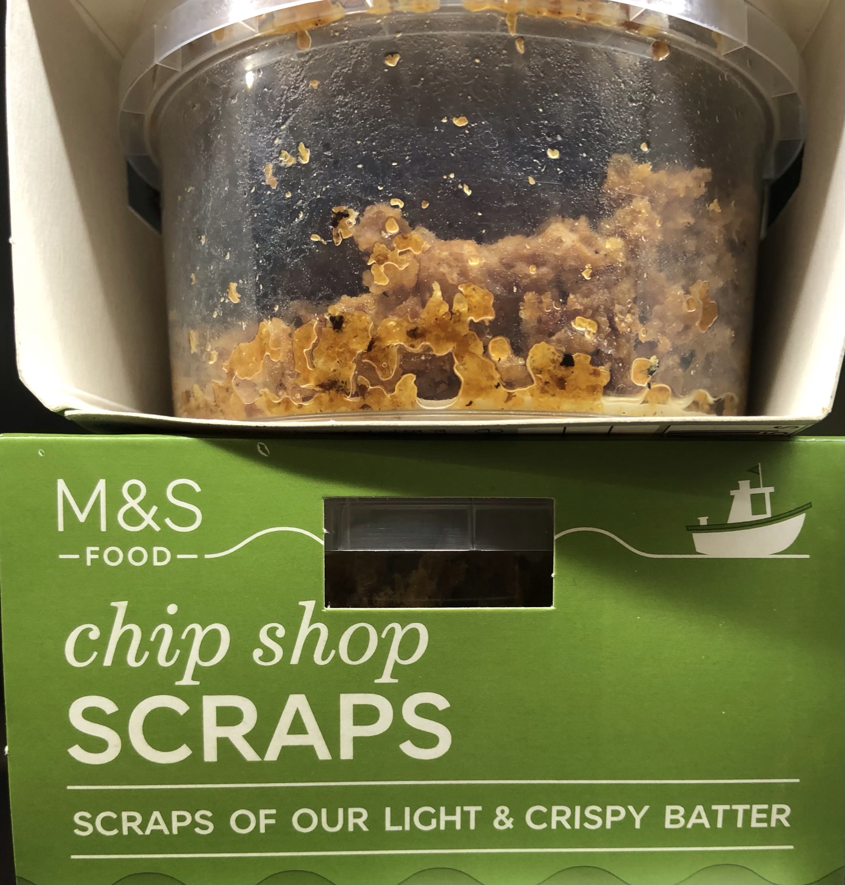 Yesterday whilst having a mini shop in Marks and Spencer’s flagship store, I found Their own brand of CHIP SHOP SCRAPS! At £1 for a tiny box, I don’t think I will bother! I wonder how long they will remain as part of their stock ? Good question !