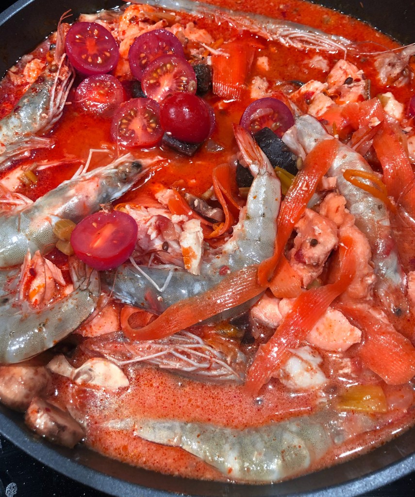 I made the other day, a fish stew. I love rummaging in my Fish freezer, deciding what has to be used, is it going to be Fish Pie, Fish Curry, hang on Fish stew with Beetroot ! YES !! And Yes again ! The colour is amazing as are the flavours !