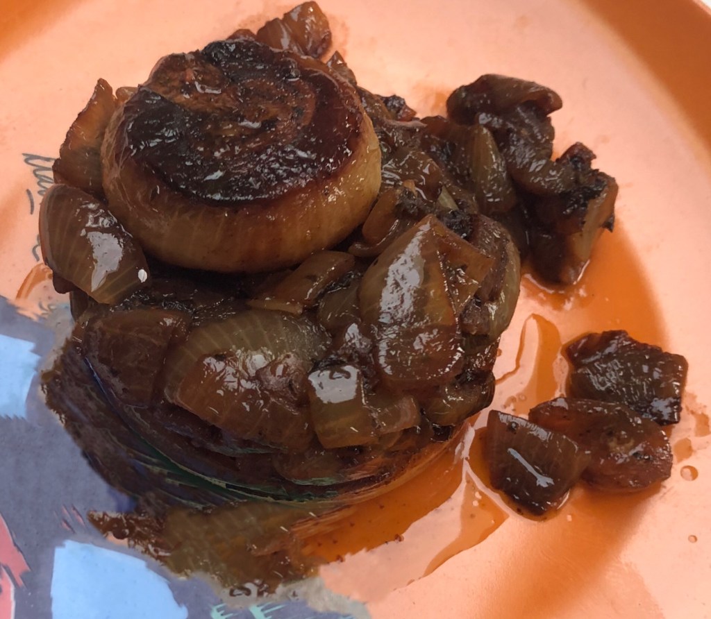 I could have made life simple by, doing smoked salmon, with its trimmings but decided to be more adventurous and make individual Shallot Tatin. Actually very easy, just a lot of shallots and lots of paper tissues or perhaps, onion defying glasses might have been better.