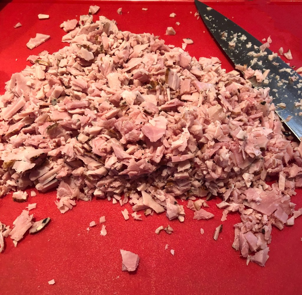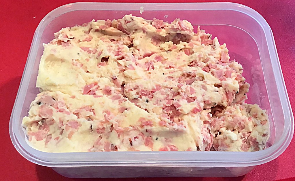 I chopped the ham finely and mixed it with the cold potatoes and actually mixed it by hand! Such a lovely squeezy feeling as it oozed through the fingers.
