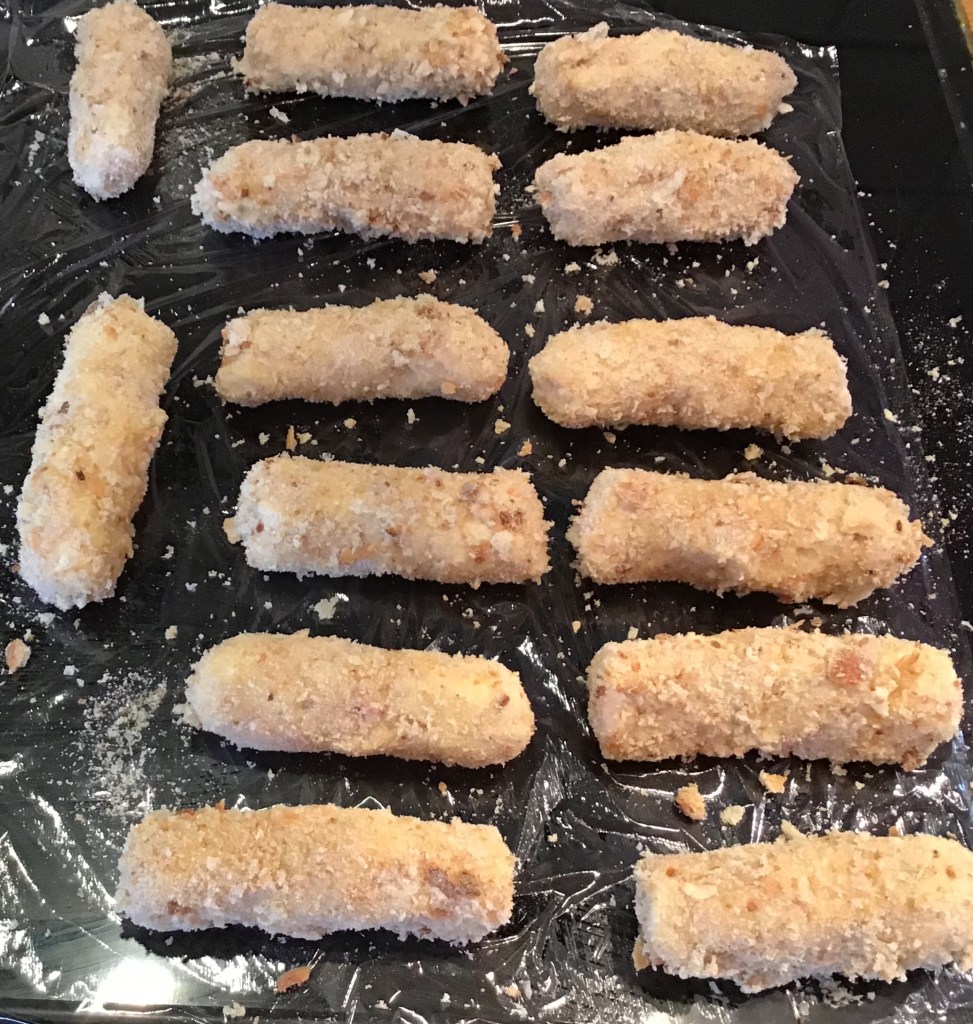 I made the Croquetas by scooping out about a dessert spoonful of the mixture ( I used my ice cream scoop). Roll the mixture in a little flour, so it doesn’t stick, then in beaten egg and then in breadcrumbs. Repeat until all of the mixture has been used!