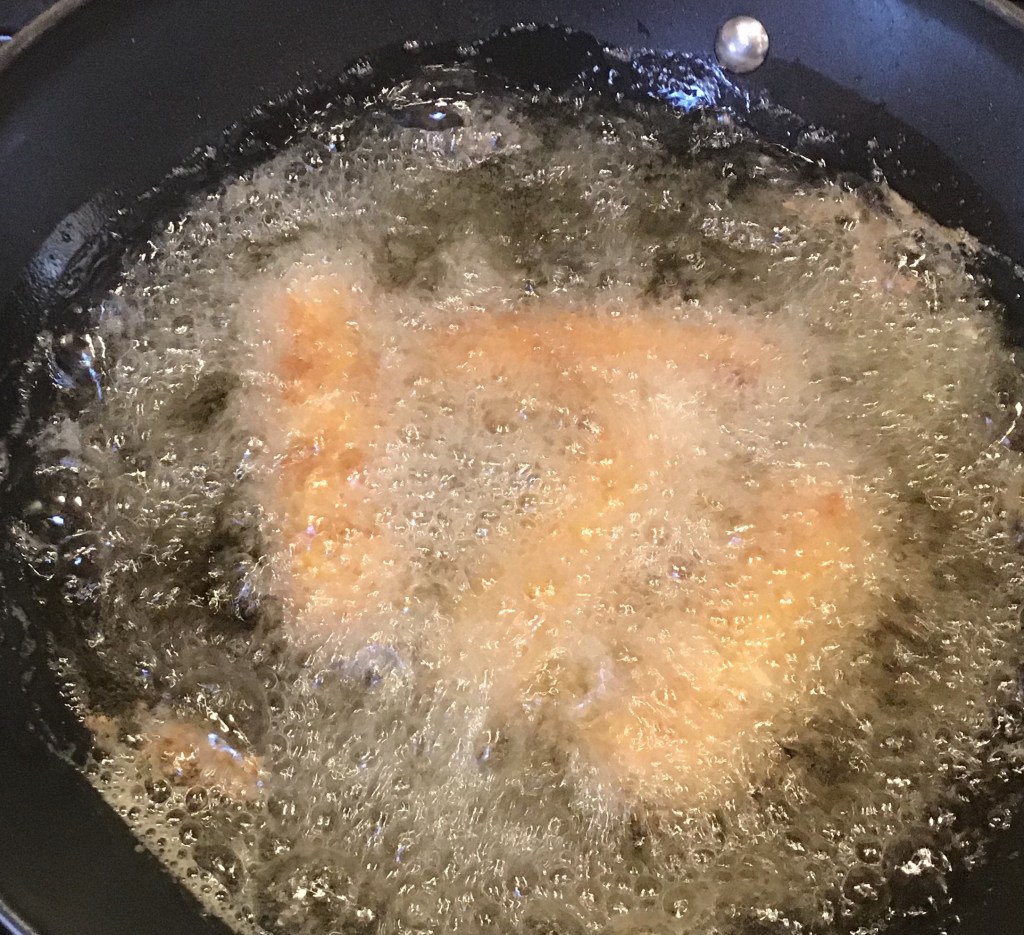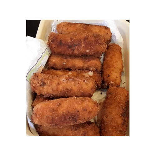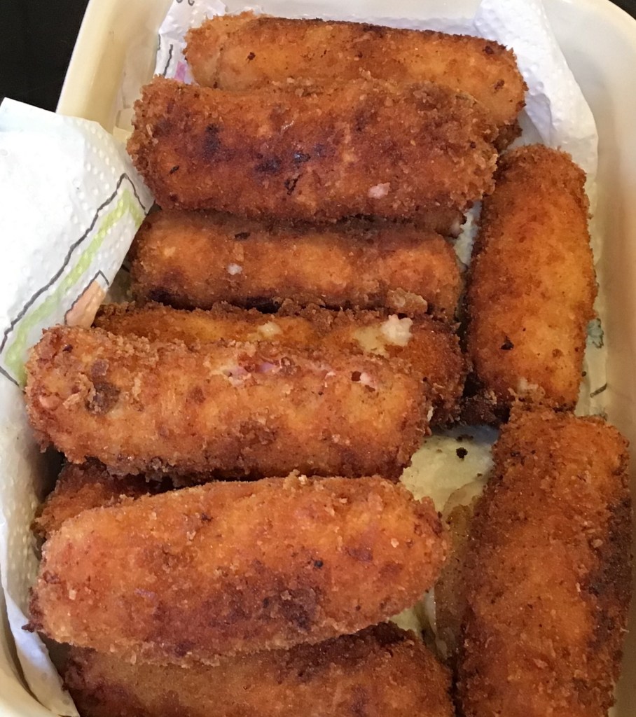 Heat some oil in a pan or deep fat fryer ( I prefer to use a small wok as you get the depth of oil, without using oodles of oil.) Heat the oil, keep an eye on it, do not let it smoke ( burns) . Test for readiness by dropping in a small amount of bread, if it sizzles straight away, it is hot enough to use. Fry the Croquetas in small batches. If you have sufficiently coated in egg and breadcrumbs, the cheese will begin to ooze out. When brown, remove from the oil and drain on paper. Refrigerate until ready to use, can be used as a side dish or as munchies with a glass of bubbles or something!