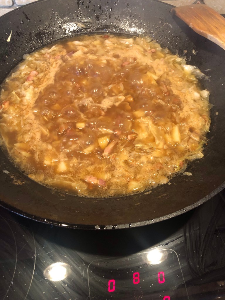Stupidly, as perhaps as is normal for me, I made too much. But as I say always, waste not want not and this was no different. Potato was packed into a box and refrigerated. Of course I could have just reheated it but that was too simple, especially as we had house guests and we decided to trudge up the hill in knee deep snow to our local. ( the only cafe / bar/ mini restaurant/ depôt de pain in our little French Village). I say knee deep in snow, it wasn’t knee deep when we went but it certainly was upon our return!