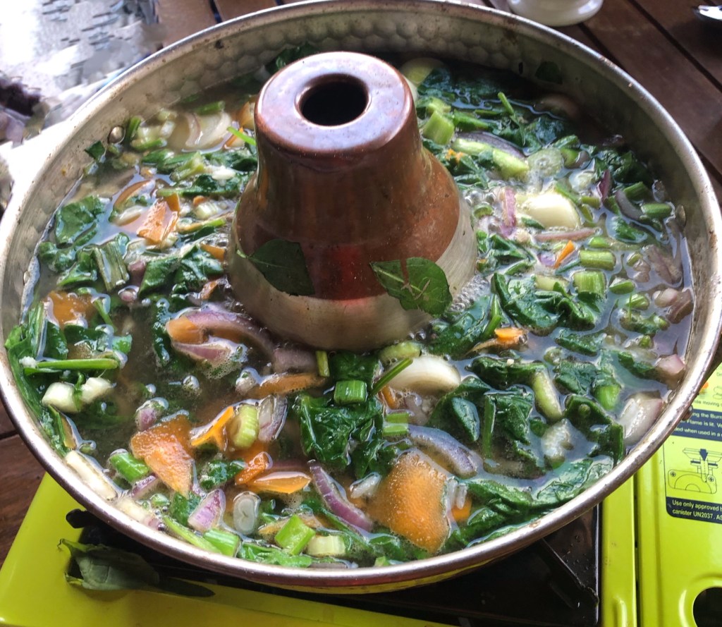 Before the kids left, I defrosted some steak and decided to have the Japanese dish of Shabu Shabu. It is an onomatopoeic word, literally meaning Swish Swish. It is the sound made when swishing ingredients around in the pot. It is made at the table, with thin slices of meat and sometimes seafood, on skewers which are swished around in hot liquid or broth for a few minutes and eaten hot with a variety of sauces. Then shredded vegetables are added and a broth is made. Our improvised version, used thinly sliced steak ( best to slice whilst still frozen) and an assortment of shredded vegetables which could included, carrots, cabbage, pak Choi, mushrooms, kale etc. we also used some light stock as the base, though I believe in Japan, they start with water. Great communal meal for all ages. To make this all you need is a good sized pot and some sort of heating device, some fondue forks or chop sticks, some sauces to go with the steak, and here we used what we had, Teppanyaki, Teriyaki, Miso sauce, French mustard and Piri-Piri mayonnaise! Not particularly authentic, but it is what the 8, 13 and 15 year olds decided! They love Shabu Shabu.