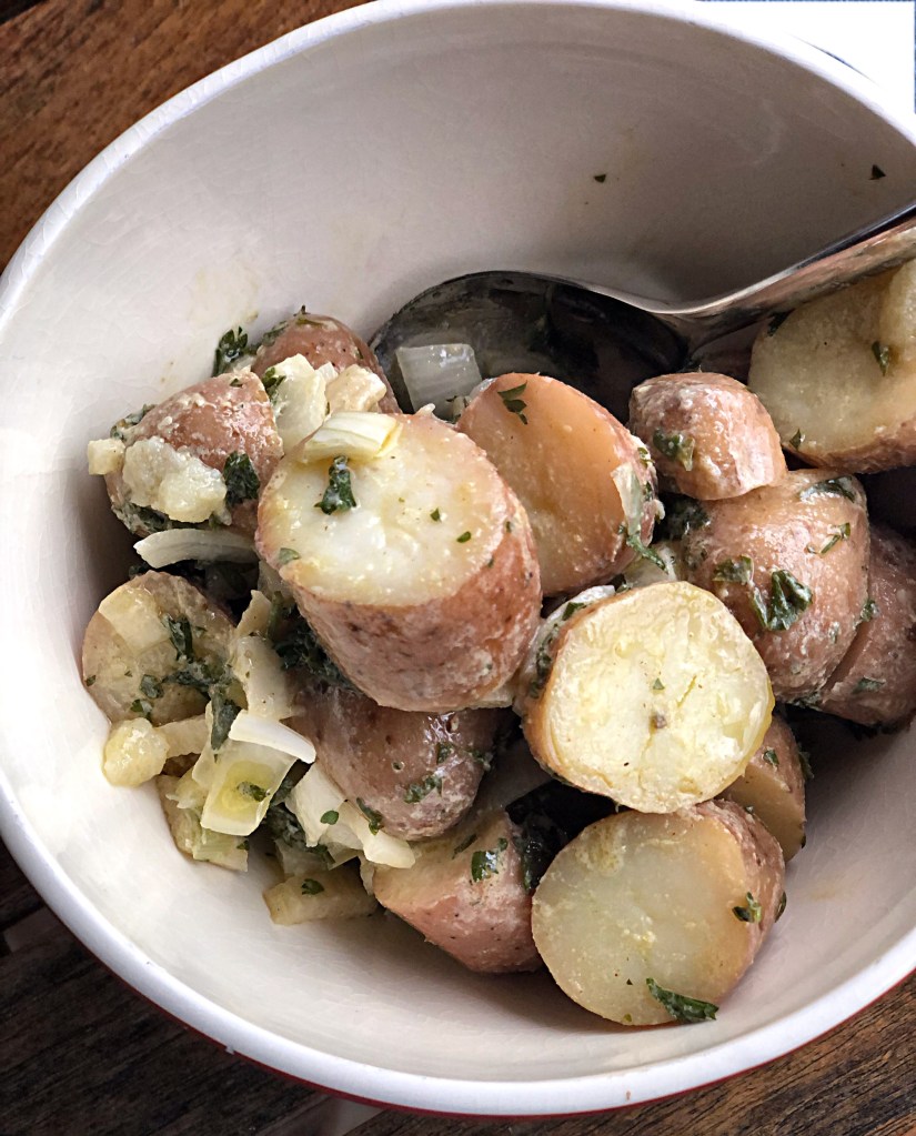 Warm potato salad, made with small new potatoes, cut into chunks, not peeled, and these I threw into the microwave ( cheapest and most efficient way of cooking) via the microwave container, cooked on high for 5 minutes , added some chopped spring onions and a slug of good olive oil ! Job done! Do not refrigerate as then it will no longer be warm potato salad !