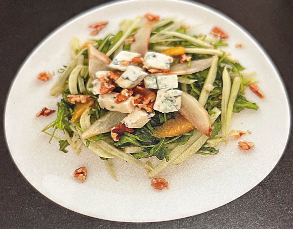 The dressing for this salad very simple and good, just orange juice and a little olive oil. He used strips of fennel, but we feel that strips of celery would be better, giving a little more flavour and texture ( crunch). He also added small tomatoes ( piccolo) cut in half, and he also added the orange ( mandarin) segments. If using Gorgonzola make sure you keep it chilled before using as it will go soft too quickly, but try other blue cheeses such as Stilton, Bleu d’Auvergne, Cashel, Colston Bassett, Fourme d’Ambert, Roquefort, Saint Agur, and even Moody Blue and Moo and Blue! There are +/- 200 different blue cheeses to choose from ! So take your pick!