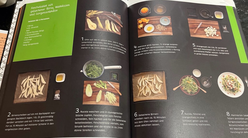 Consequently, Himself was equally impressed and decided to make a salad. It was much more than throwing a few bits of lettuce in a bowl, and it really was delicious. It was labeled Fenchelsalat mit gebachener Birne, Walnussen und Gorgonzolakäse, translated as, Fennel Salad with roasted/baked pears, walnuts and Gorgonzola.