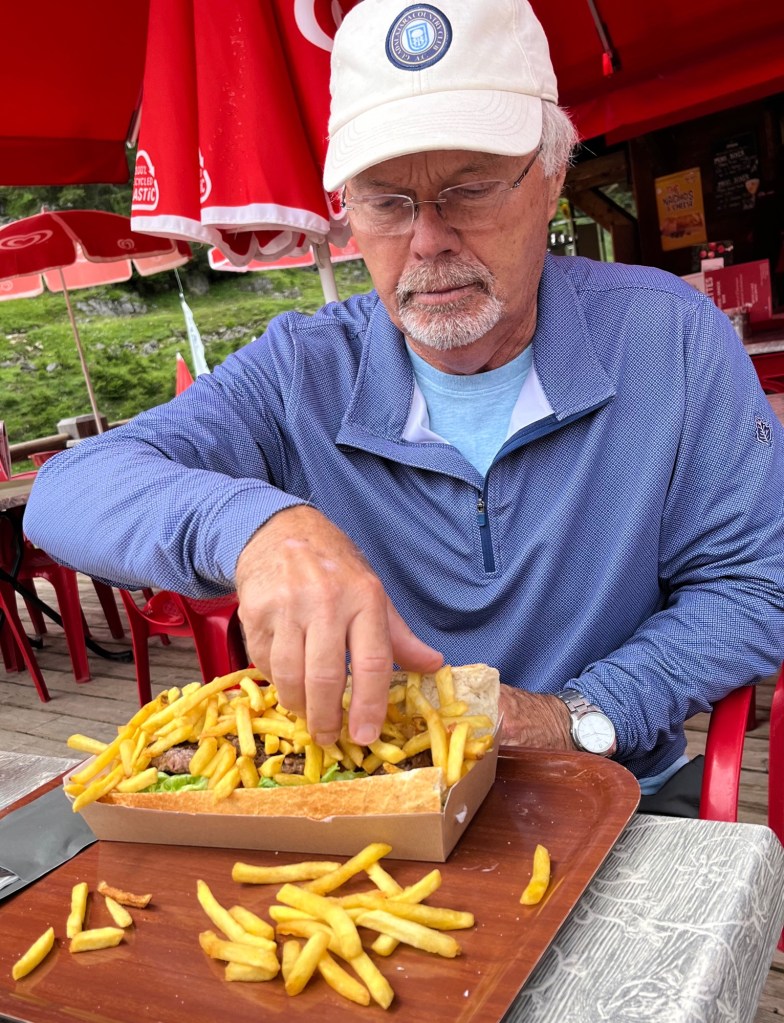 I have already mentioned Sam, our 9 year old grandson, he came to stay for a week and then as well friends from Texas. She has been over many times and is a big friend of Sam, but him is new to travelling and so it is all new to him. He fancied a steak sandwich for lunch ( after all he is from Texas) and assumed he had ordered one but it turned out to be basically a double Hamburg’s patty in half a banquette.