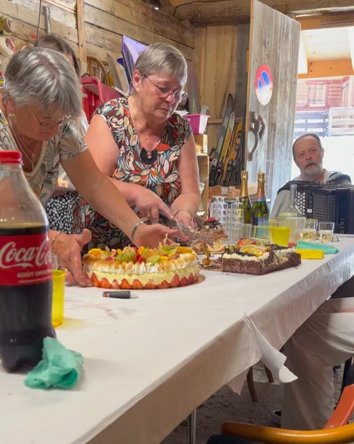 This Sunday, was the day of the Festiplan, normally a yearly get together in May, but apparently July is the new date and we were duly invited. At noon sharp, it was Apero chez Martine, nibbles galore and then at one we all decamped to Babette’s Barn, what a Glory Hole it is, with STUFF stacked into every nook and cranny and beyond, and yet, it had been cleared and cleaned sufficiently for them to erect tables for 30, young and old were there, the youngest being about 10 and the oldest 80 +. It was Bonkers but in the nicest way, everyone brought along something, wine, water, salads, quiches bread, cold meats, cheeses, champagne and a birthday cake ( someone was 15) but not just one cake but two, and everyone was given slices of both. Jean-Claude played his accordion and Martine made the coffee. We left exhausted after 6 hours of French Bonhomie !