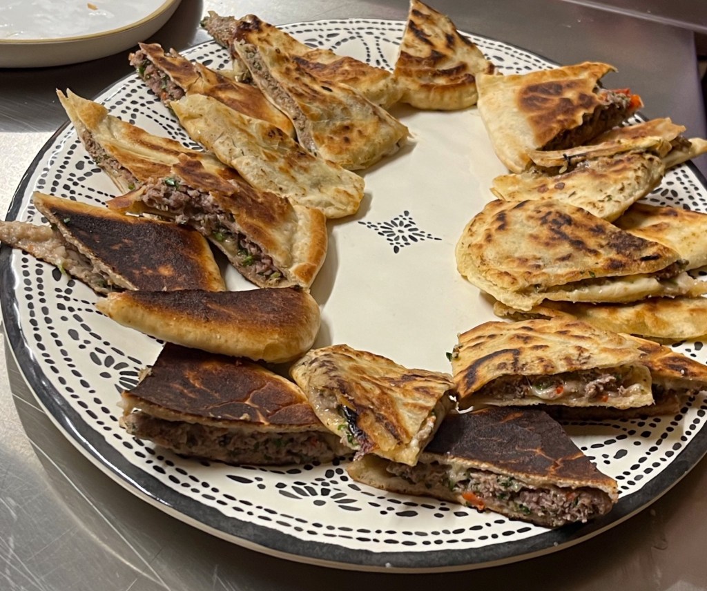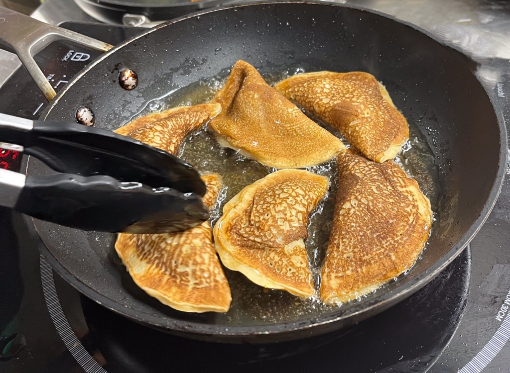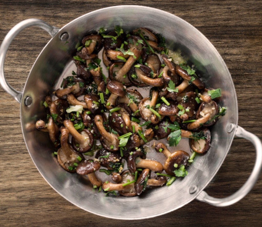 Add more butter to the pan and sauté the shallots and then the mushrooms, then the parsley and garlic. Chop all finely and leave to cool.