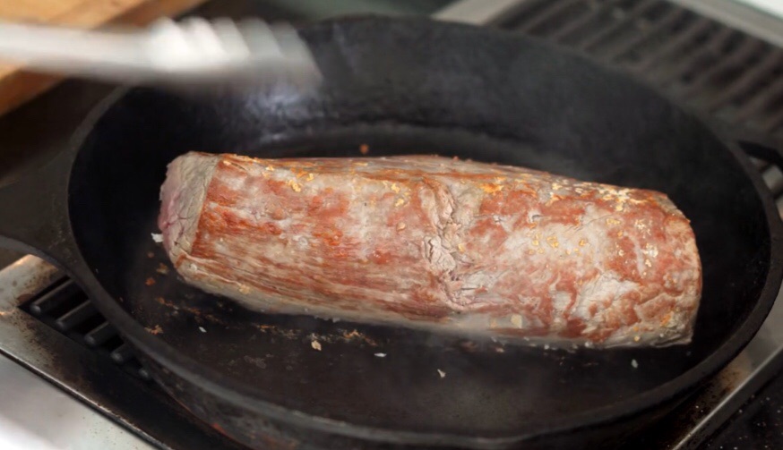 Season the beef all over with the salt and pepper. Melt a knob of butter in a sturdy frying pan and sear the beef on all sides.
