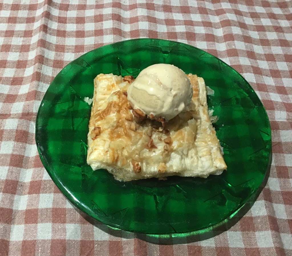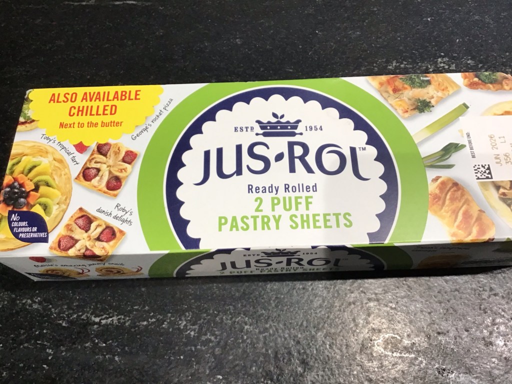 - 2 sheets of either frozen puff pastry or chilled puff pastry. Easy to buy in the UK, but much of the frozen / chilled pastry in France, tends to be in circles, either for a tart or for pizza.