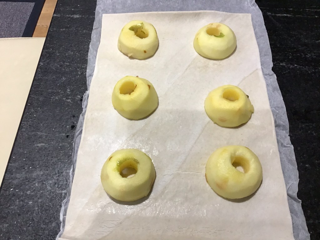 - If using three apples, cut them in half and place them, equi distant on the pastry.