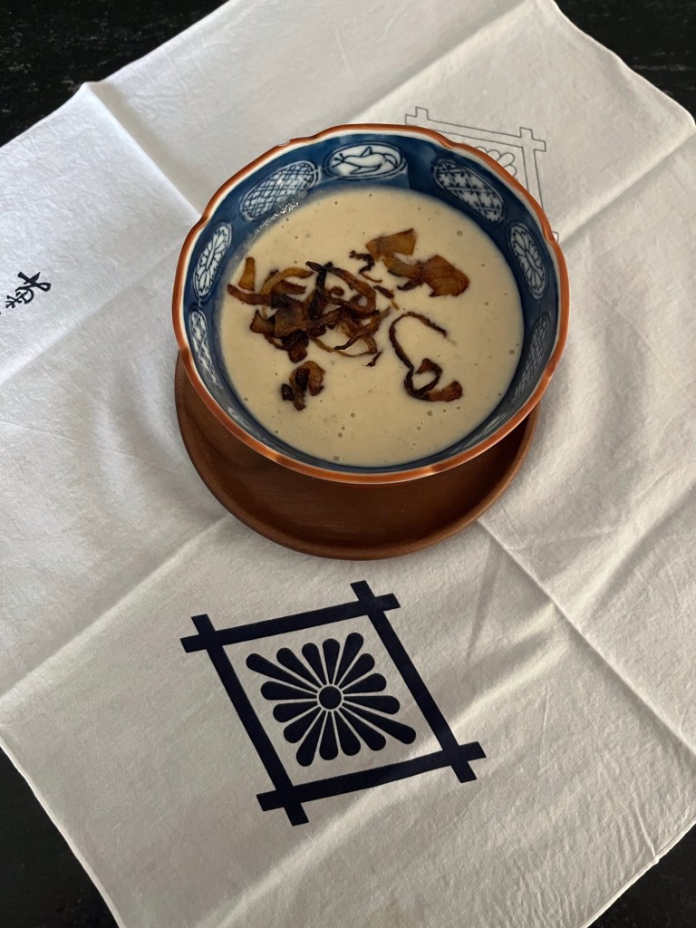 For the caramelised soup, start off by gently sautéing the sliced onions in butter or olive oil until they are crispy and brown, remove from pan and drain on paper towel. Put to one side.