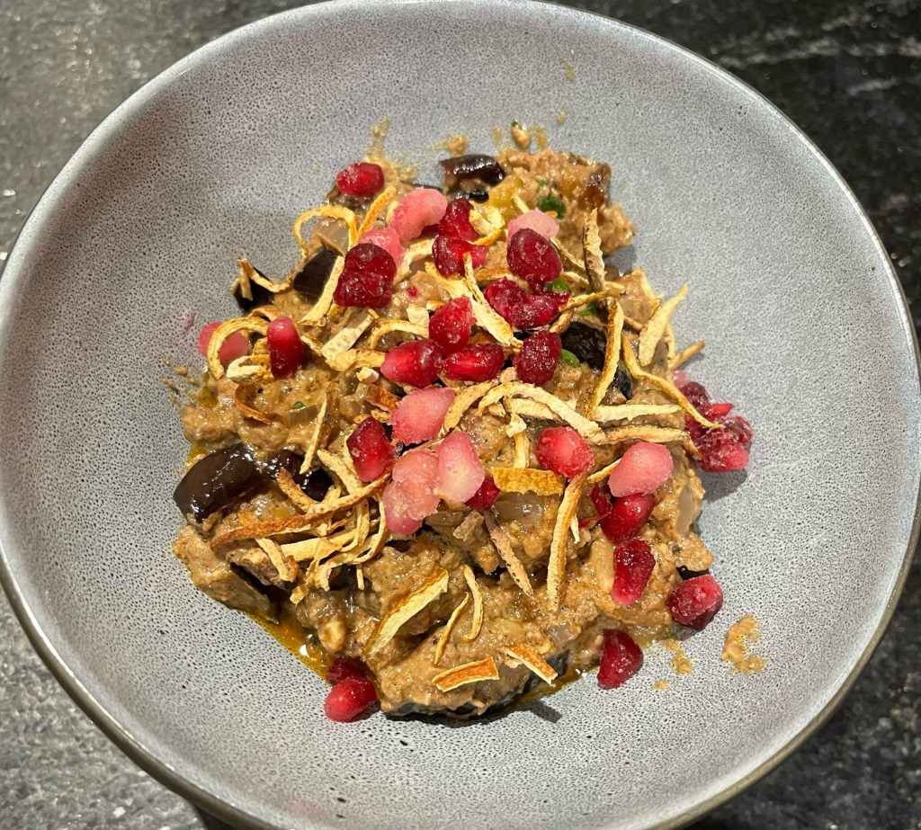 Finish by stirring in the aubergines, heat for a few minutes more, and then serve along with the pomegranate seeds and additionally maybe orange rind and Indian fried onions to garnish.