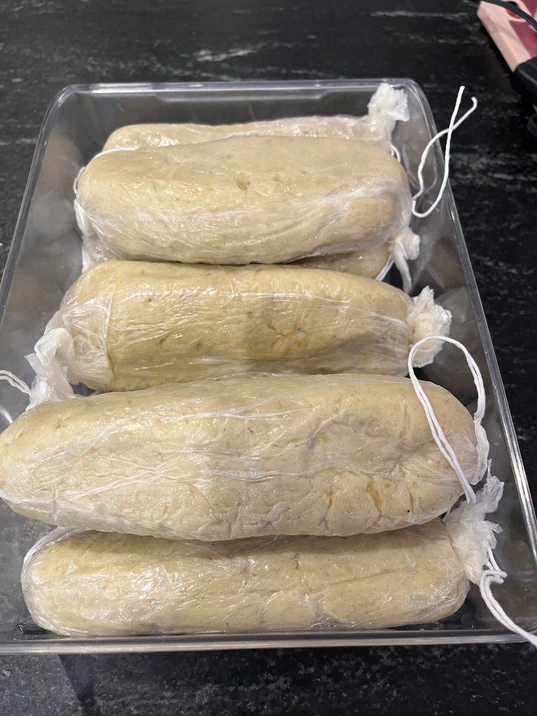 Add the flour, cheese and beaten eggs and mix well ( can use an electric mixer). Place sheets of cling film on the work surface and spoon 20-25 cm of mixture on the cling film, leaving space at each end to to tie the ends up. Repeat until all of the mixture has been used.