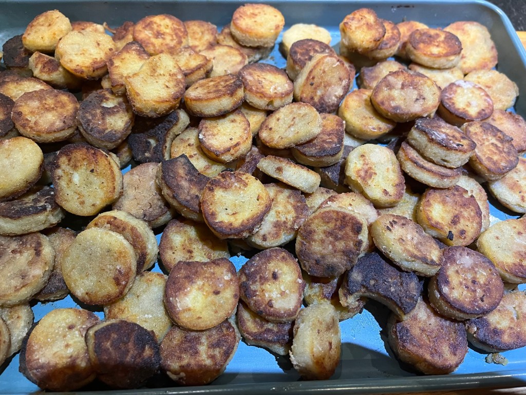 2 cms slices. Put some flour into a dish, dust the gnocchi with the flour and fry in butter or olive oil until golden brown on both sides. Drain on some kitchen paper paper and then place on a flat baking tray. Repeat until all of the gnocchi mixture has been used. At this point the gnocchi maybe flat frozen until needed.