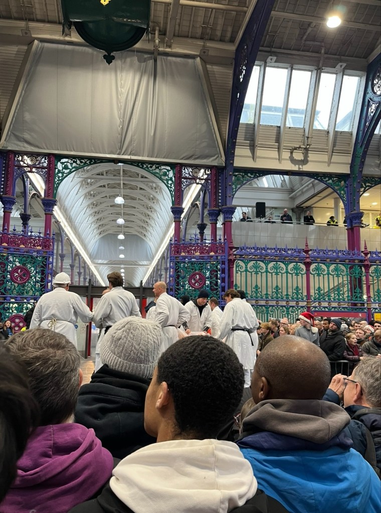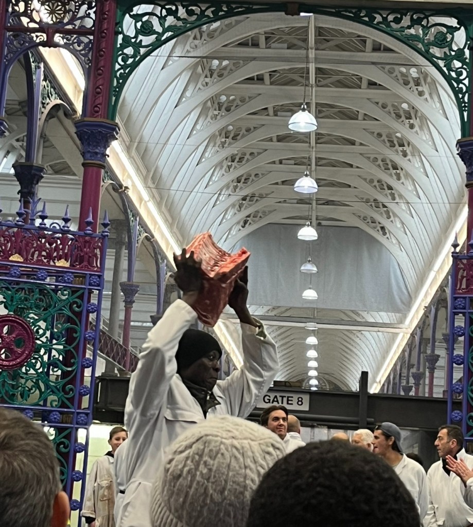 Actually for the second year running we went just four stops on the Tube to Farringdon, the home of the world famous Smithfield meat market. It is located in the Square mile of the city of London and has been there for over 800 years! on Christmas Eve, they sell off their meat, a tradition that dates back to the 14 th century, as there wasn’t refrigeration. Apart from anything else, it is really fun ! People dress up, it is really crowded and people take wheelie bags with them so that they can buy a years supply of meat at hugely discounted prices. It isn’t an auction, chiefly salesman announces what is up for sale, be it 6 kilos prime ribs of beef, half a lamb, a goose, a turkey, several kilos of stewing beef, a while saddle of lamb! Whatever it is, there is plenty to go around for all, the butchers walk around a stage, the buyers hold up their cash, then the meat comes over their heads and the cash passed forward.