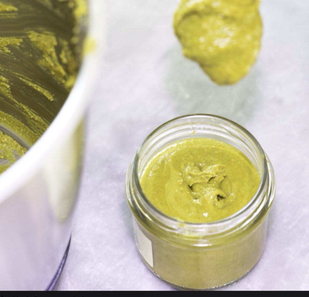 Simply buy some unsalted and not roasted pistachios. Blanch them for about 45 seconds in boiling water. Rub then in a dry the towel to remove any skins and leave them to dry thoroughly. When dry, tip them into a food processor and grind. The stages of grinding are Nuts>Crumbs>Powder>Paste! Add a few drops of good olive oil to make the paste easier to blend together and that is it !