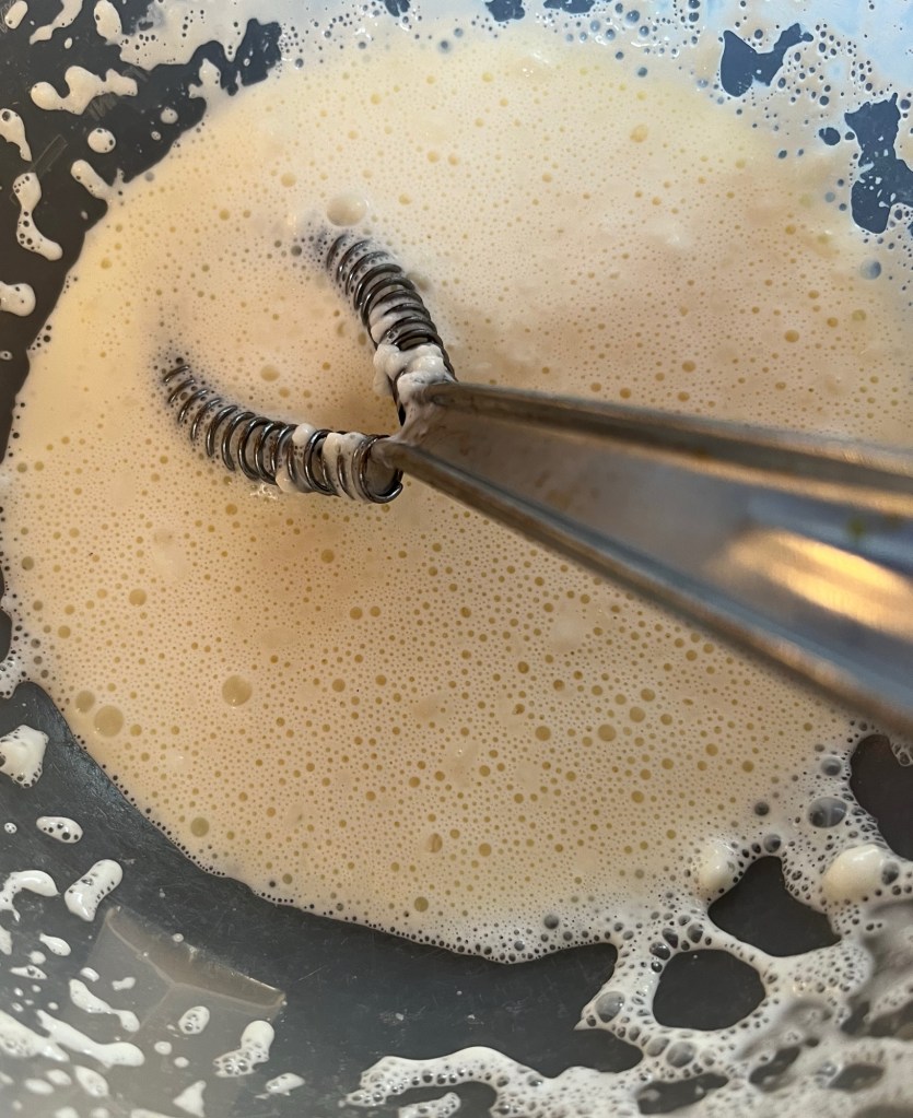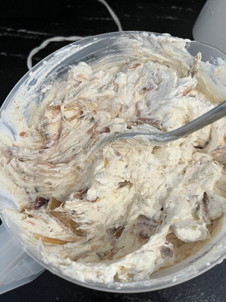 Moving on, I made my ice cream. When passion fruits were very much in season I bought several and kept the pulp which I froze until ready to use. I always use Ben and Jerry’s basic recipes for making ice cream and this time was no exception. According to Ben and Jerry ( they are real people) the list of fruit ice creams is pretty endless, with Banana having no added sugar to apples and raspberries needing a fair amount. However, I would go with the basic and have a taste ( what a good excuse) and add more if it is too tart. They didn’t actually have a passion fruit recipe, so I had to wing it, starting with a sweet cream base. However before you start switch on your ice cream maker if you have one to make sure it is cold OR have a container in the freezer also that it is cold.