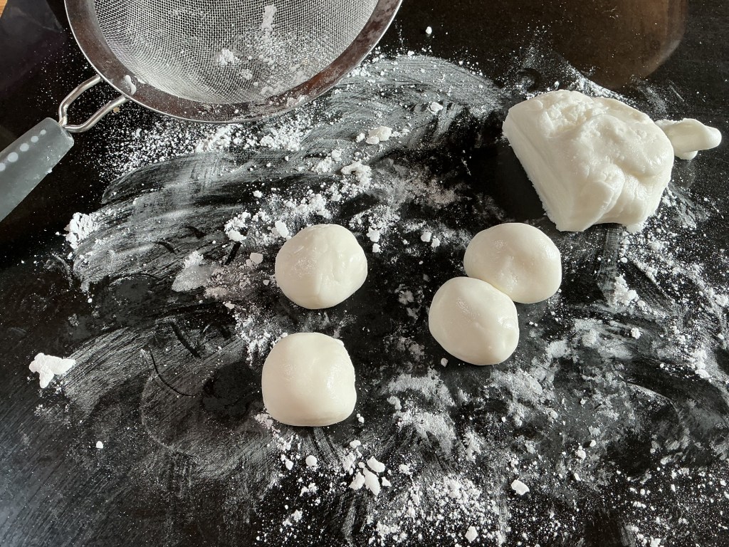 Add the flour, cheese and beaten eggs and mix well ( can use an electric mixer). Place sheets of cling film on the work surface and spoon 20-25 cm of mixture on the cling film, leaving space at each end to to tie the ends up. Repeat until all of the mixture has been used.