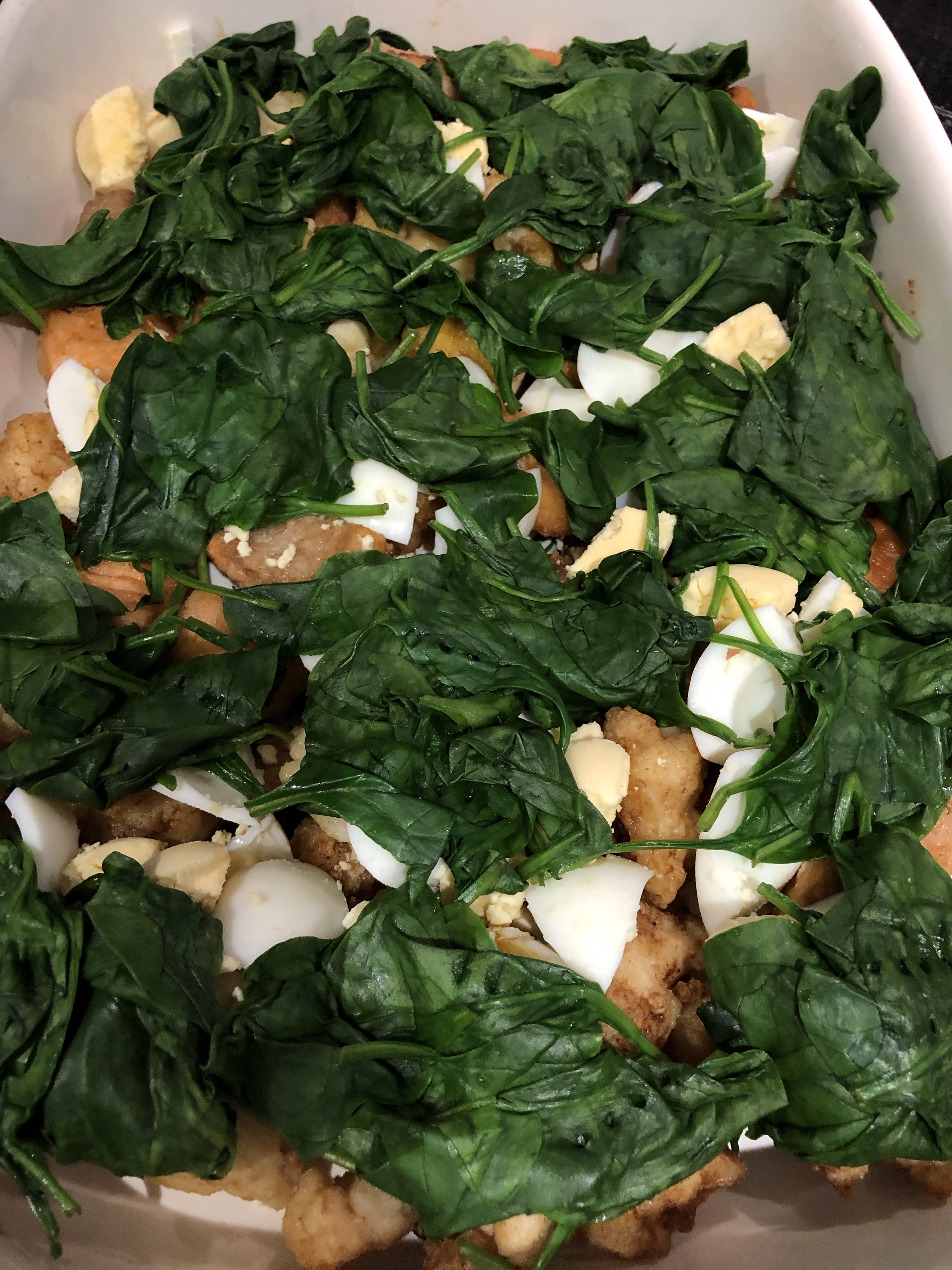 Cook the spinach, I buy ready washed spinach ( lazy I know) as then I can just pop the bag as it is into the microwave and zap for two minutes, pop open the bag, remove spinach and drain in some paper towel, it will not be very wet anyway.